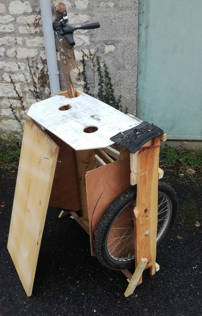 Production printemps 2020 selon opportunités : planches de bois données par un voisin, 2 petites roues de vélo récupérées, temps de confinement.