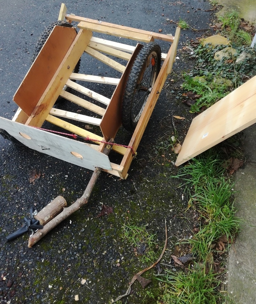 Barre d'attache vers le vélo : c'est du bois brut avec son angle naturel, pièce unique. J'en ai cassé pas mal avant celle-ci, qui tient bien.