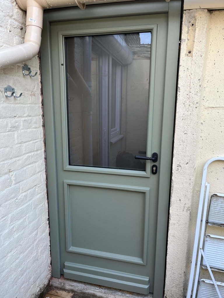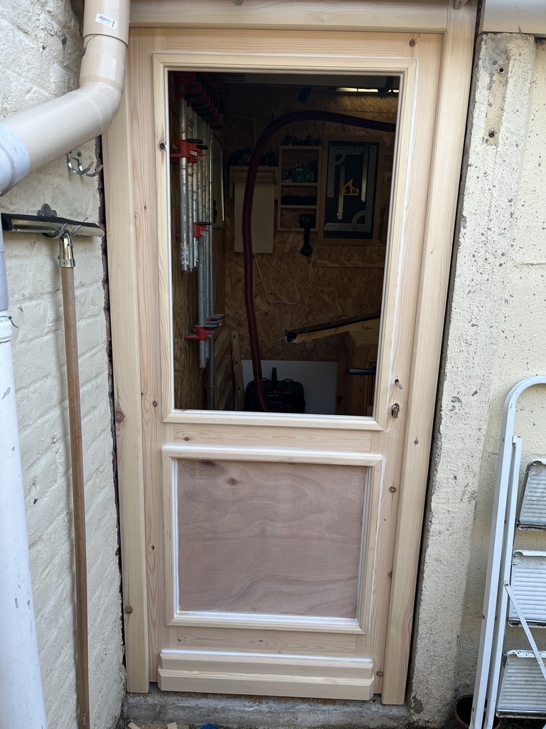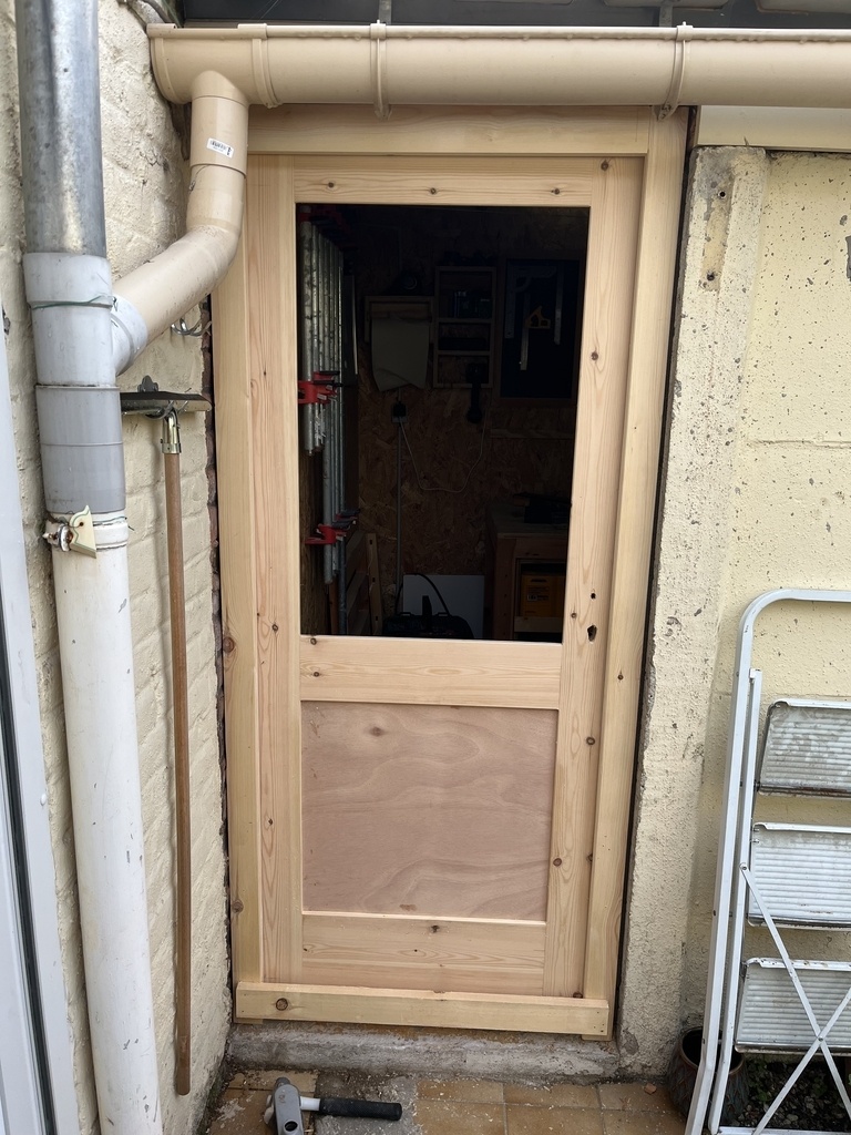 J’ai enfin une porte pour mon atelier !Je suis resté longtemps sans porte et il était temps que je tente d’en faire une.Je suis assez content du résultat ( pour une petit bricoleur comme moi )Porte en pinAssemblage par faux tenon.