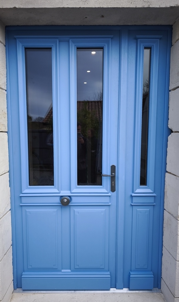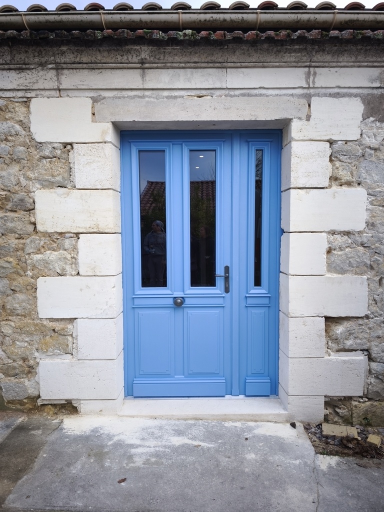 Porte en châtaignier avec un fixe.Grand cadre , panneaux saillants, cremone trois points .Peinture unikalo extérieur et vernis incolore intérieur.