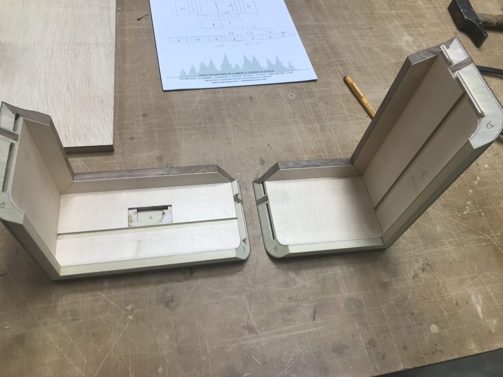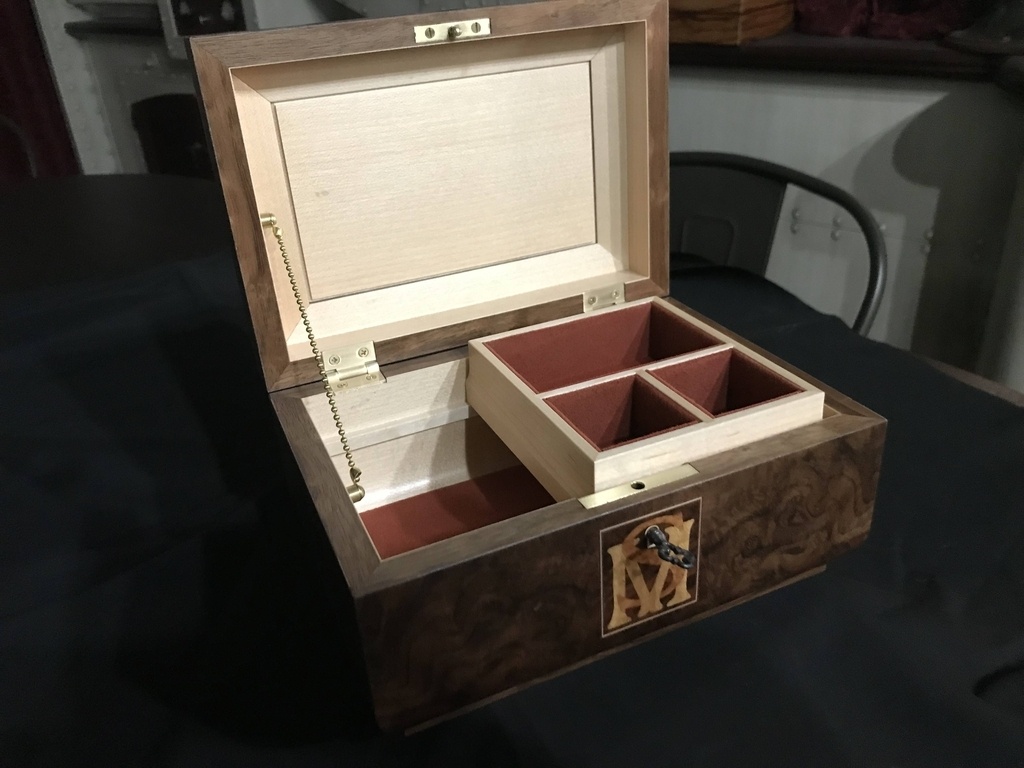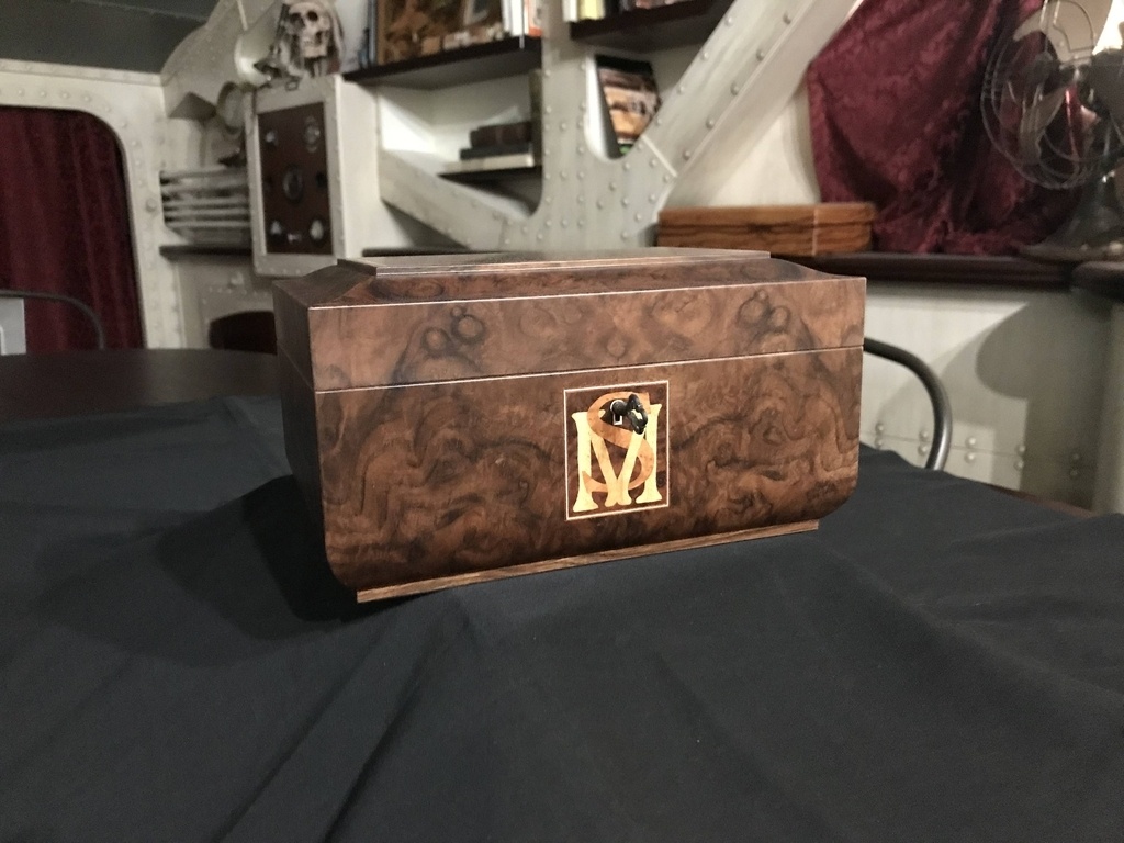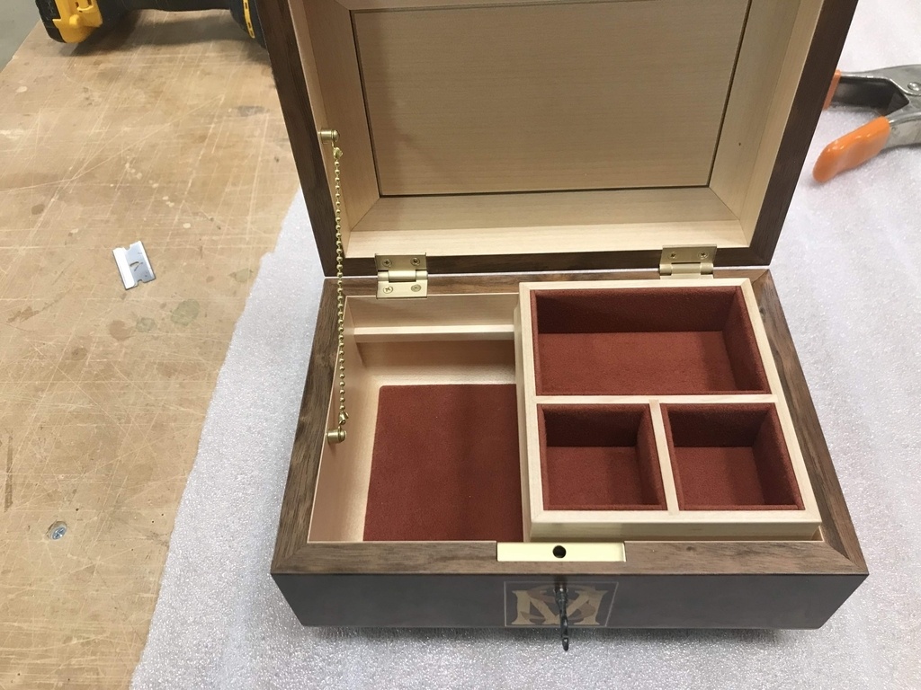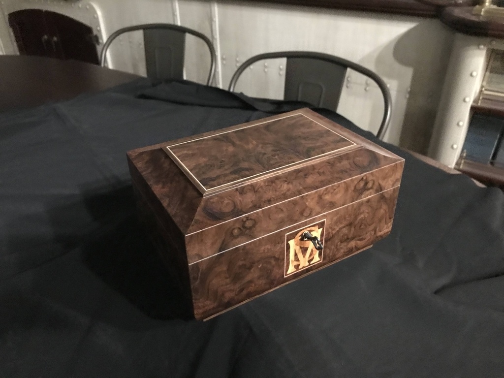 Je voulais faire une boite pour un vieil ami d enfance ,une fois dessiné sur Fusion 360 j ai commencé par faire des fers a toupie pour les moulures nécessaires . Les cotés sont en latté ,plaqué avec un CP de 0.8mm puis le placage.