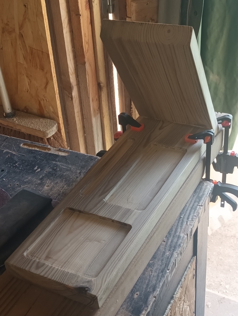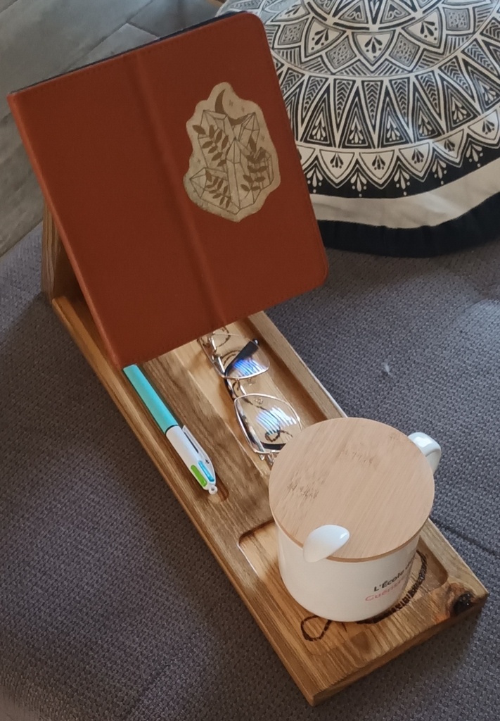 Réalisation d'un support de livre ou liseuse, avec emplacement pour la tasse de café ou autre, les lunettes et un crayon.