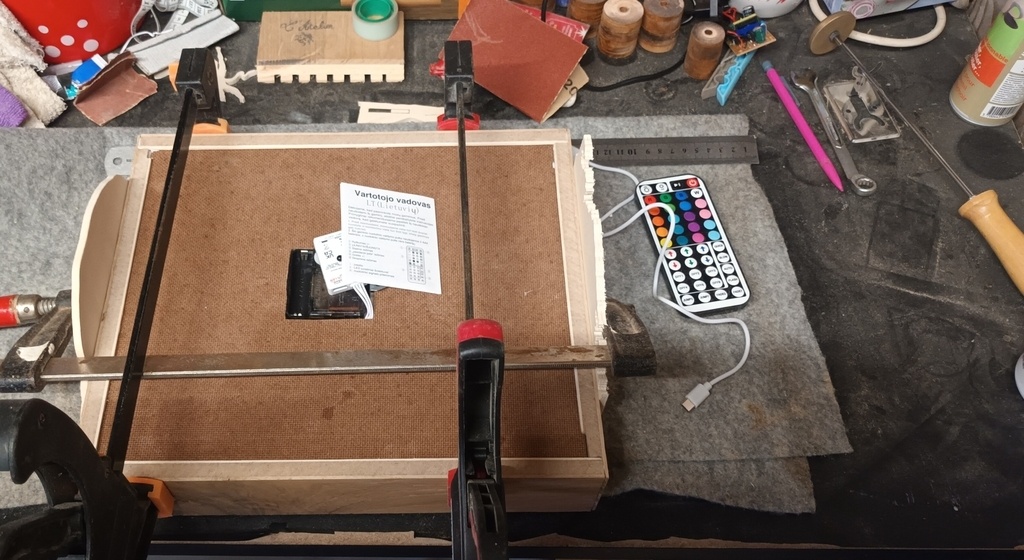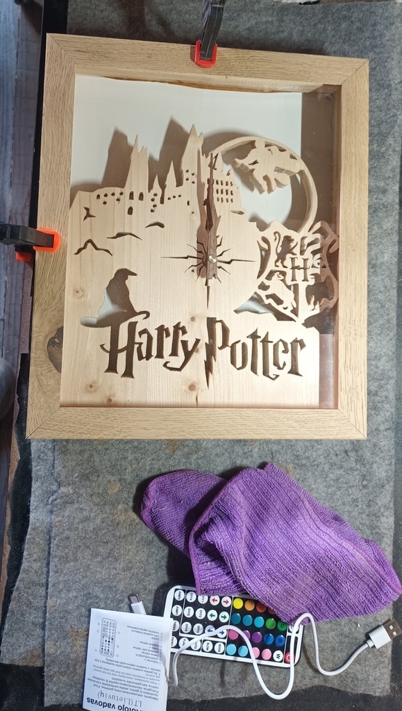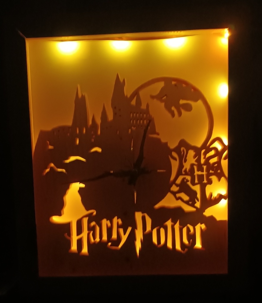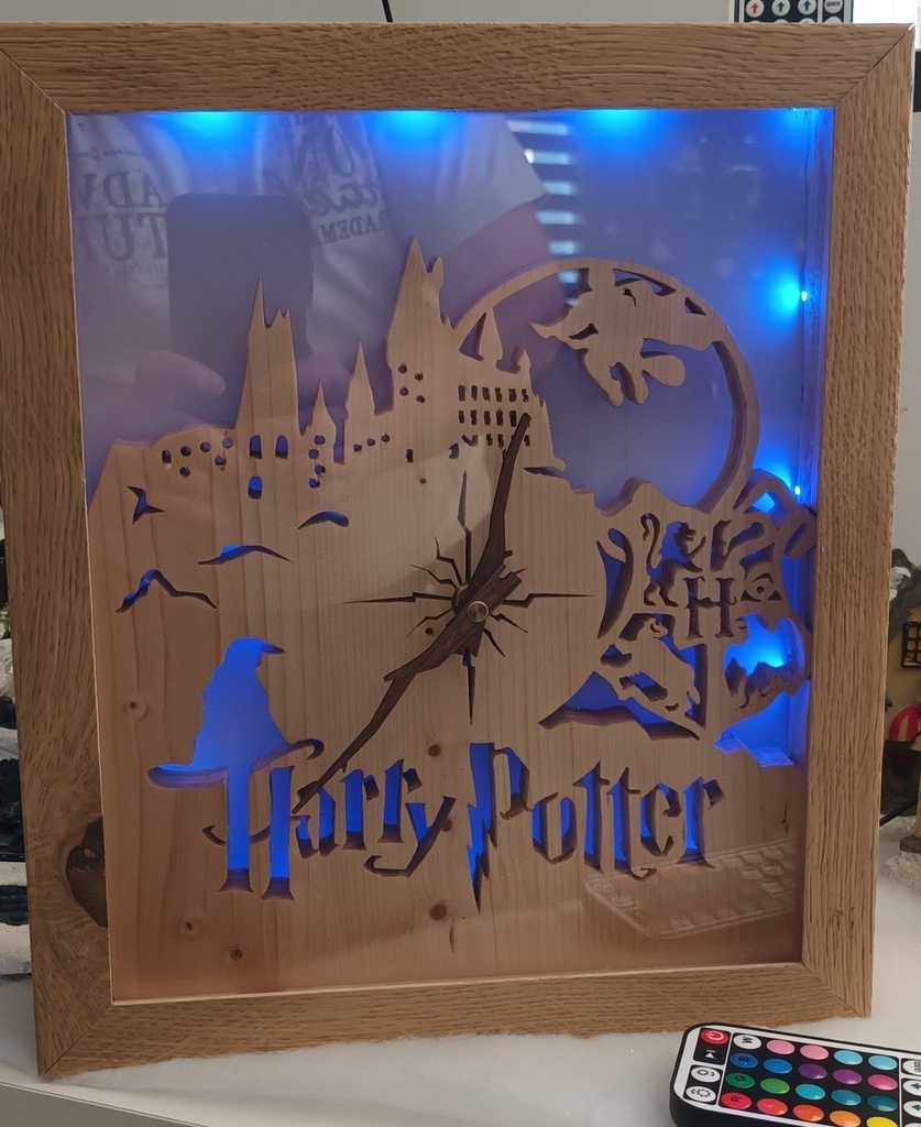 Réalisation d'une horloge murale Harry Potter, peut également être posée. Éclairage avec un ruban adhésif de leds avec une télécommande.