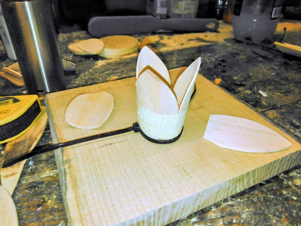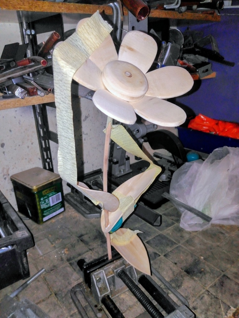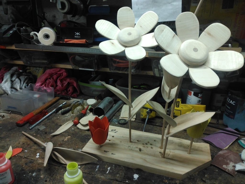 Vase realisé en noyer.Fleurs et feuilles en tilleul légerement cintré avant collage
