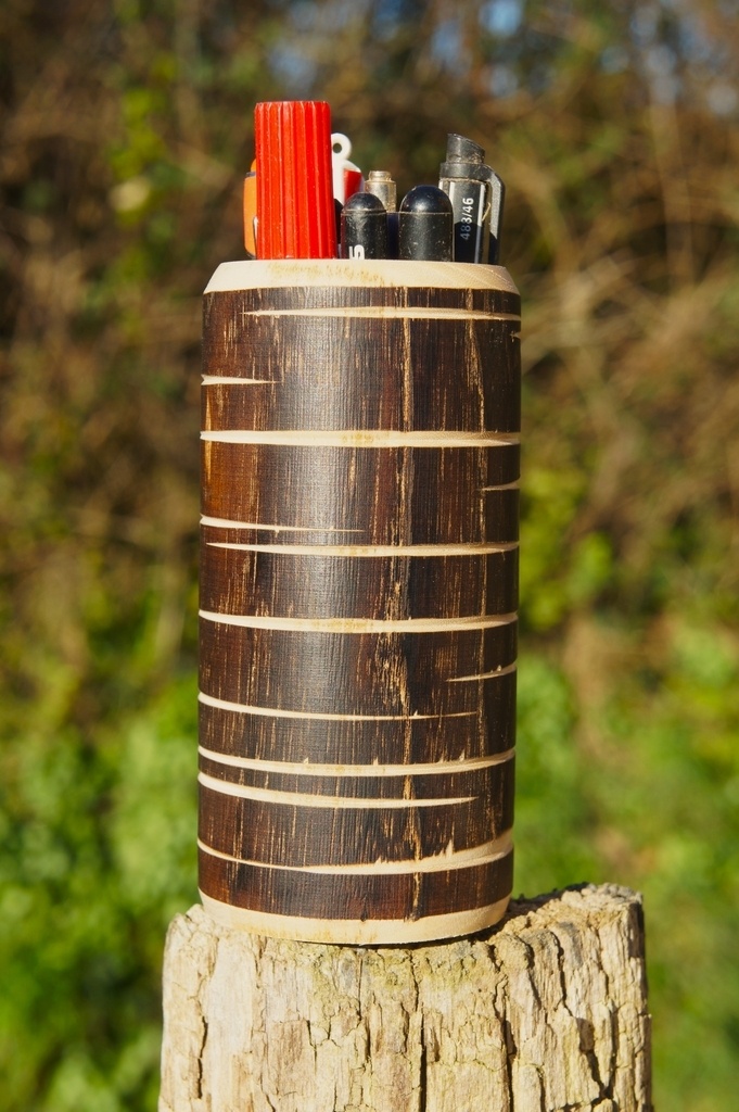 Bonjour, un pot à crayons dans une vieille branche d'orme. Brulé, puis léger excentrique sur plusieurs axes.