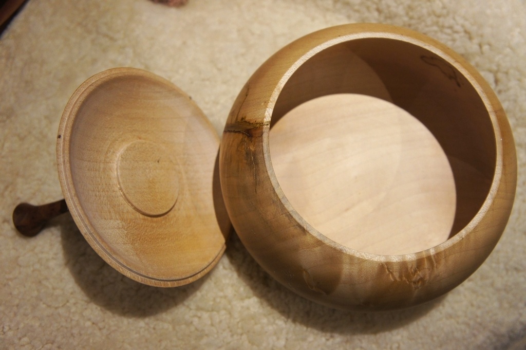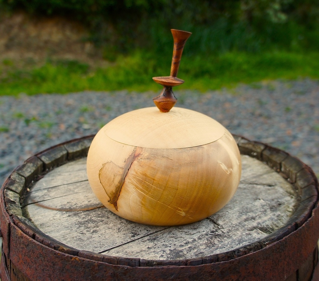 Bonjour, ma boîte pour les petits chocolats. En érable, finition huilée. Le pompon trompette est en orme.