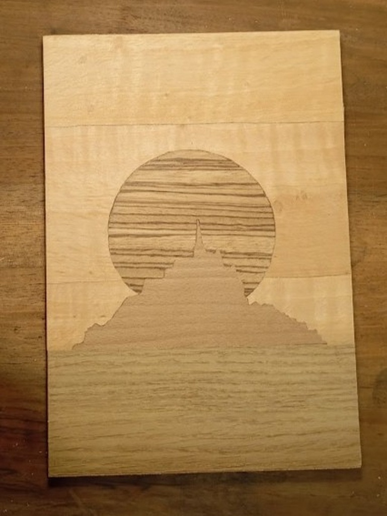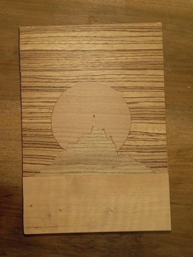 Réalisée entièrement à la scie à chantourner manuelle, j'en ai un peu simplifié les courbes mais ai pourtant eu quelques difficultés dans les finitions : le placage en aulne ayant été fabriqué par mes soins à l'aide d'une petite calibreuse, se trouve plus épais que les autres et de fait forme une démarcation peu intéressante pour ce genre d'ouvrage. Ajoutons à cela quelques embarras pour affûter mon racloir, un manque de moyens pour mettre la main sur de la colle animale habituellement utilisée au lieu d'une vulgaire colle à bois, l'absence de cires en bâton dans la plupart de nos magasins de proximité et un simple vernis au lieu de... euh ? qu'est-ce que vous utilisez comme finition ? Laque ? Vernis au tampon ?