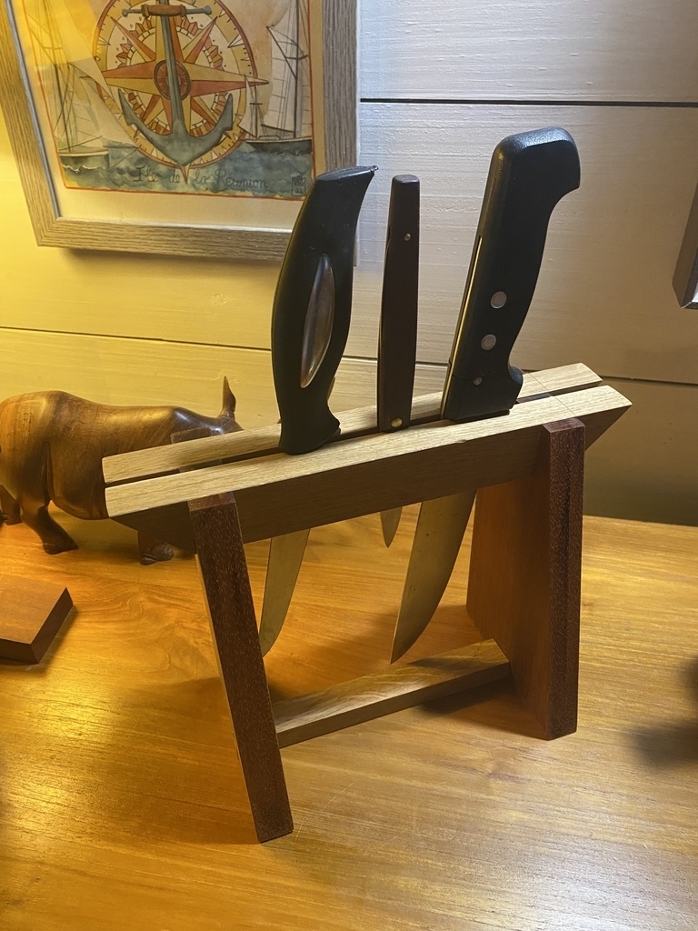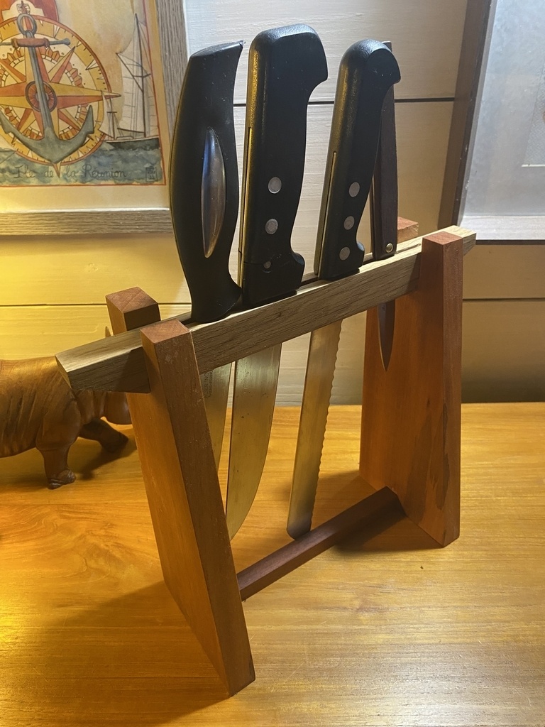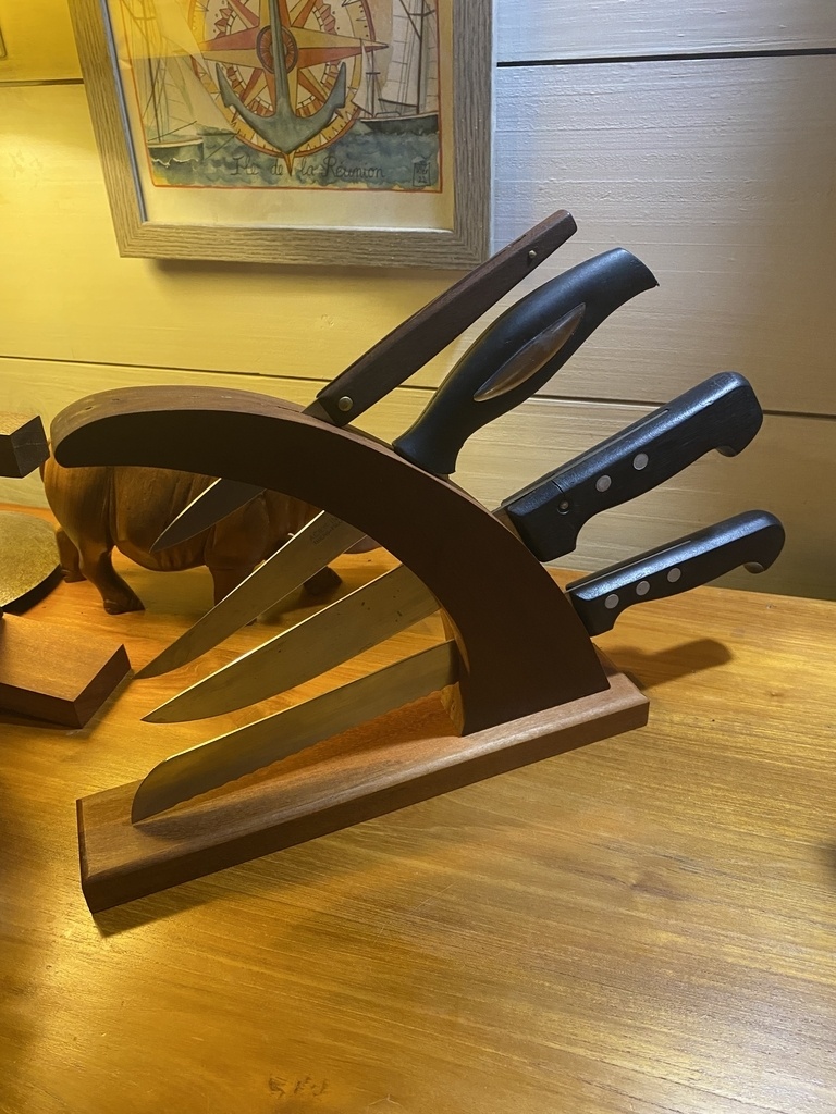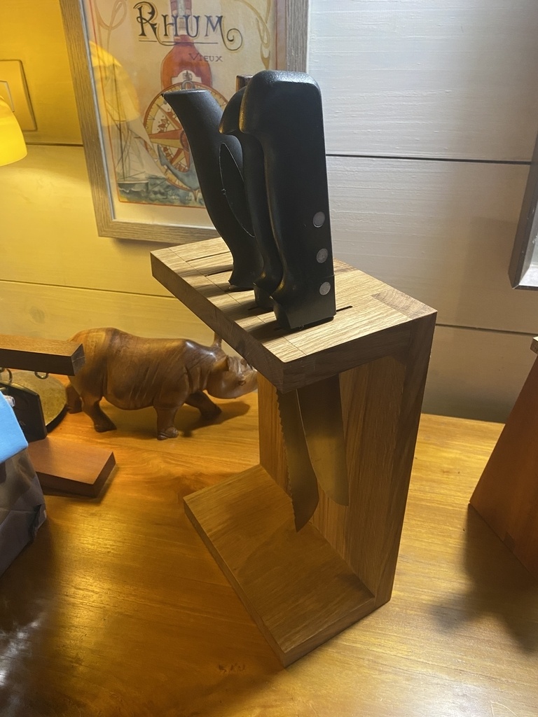 Il est plus exigeant que les autres à faire. D’abord pour l’arrondi à la râpe, et pour les espaces des couteaux. J’ai fait 2 parties arrondies de 15mm collées ensemble après avoir défoncé les espaces où vont passer les lames . Objectif qu’elles soient calées et ne glissent pas les unes sur les autres. Donc on doit mesurer chaque couteau , tenir compte du poids de la lame et du manche, puis positionner les découpes avec un petit jeu