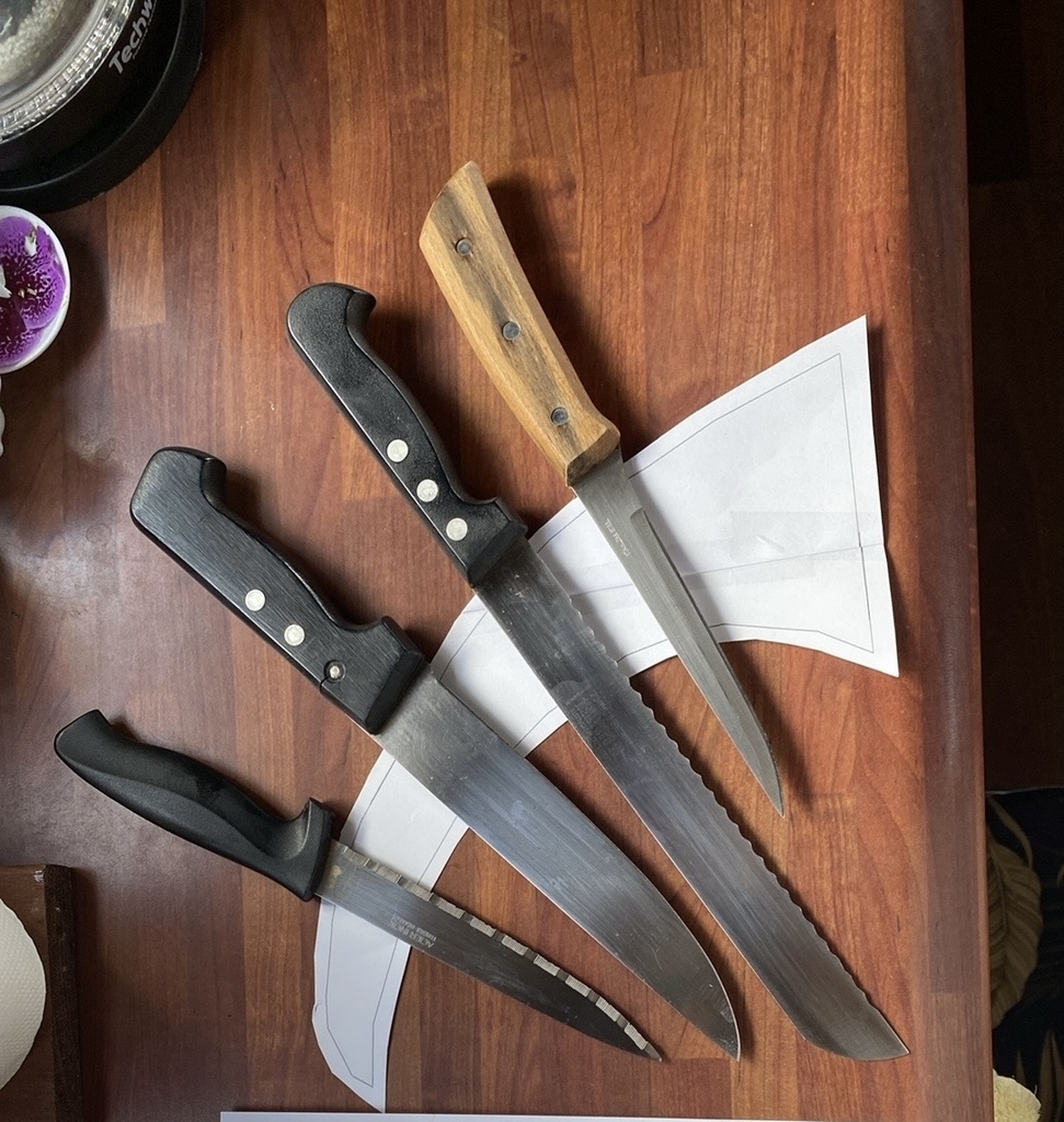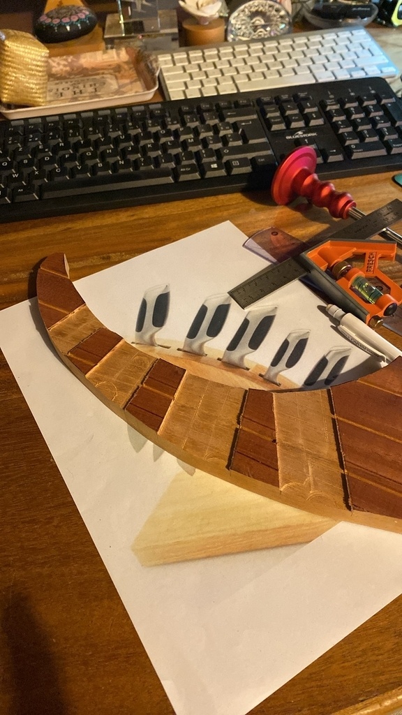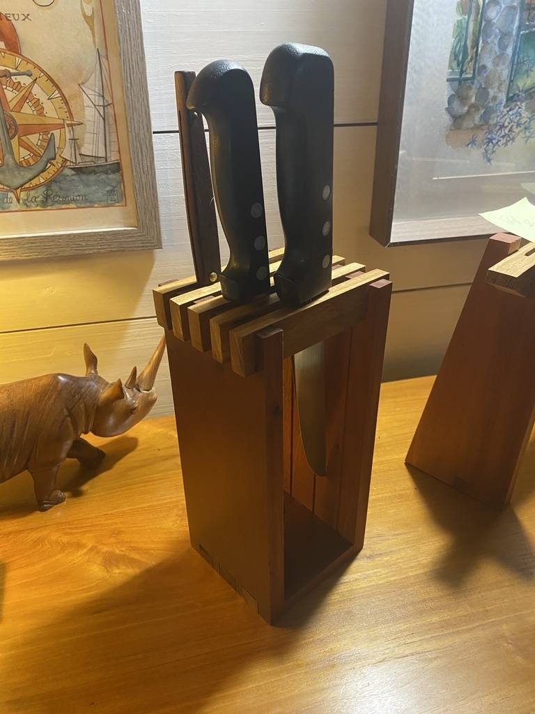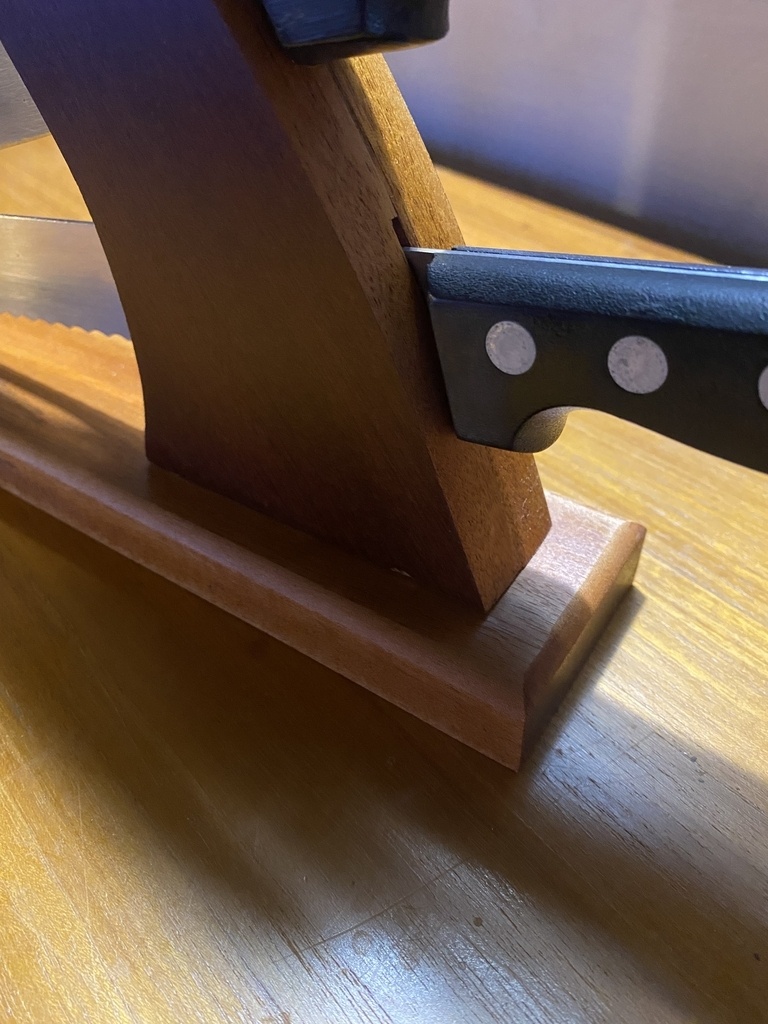 Il est plus exigeant que les autres à faire. D’abord pour l’arrondi à la râpe, et pour les espaces des couteaux. J’ai fait 2 parties arrondies de 15mm collées ensemble après avoir défoncé les espaces où vont passer les lames . Objectif qu’elles soient calées et ne glissent pas les unes sur les autres. Donc on doit mesurer chaque couteau , tenir compte du poids de la lame et du manche, puis positionner les découpes avec un petit jeu