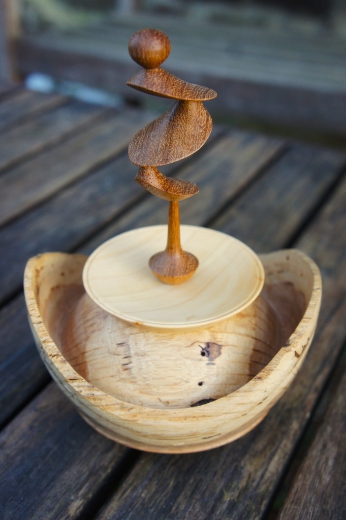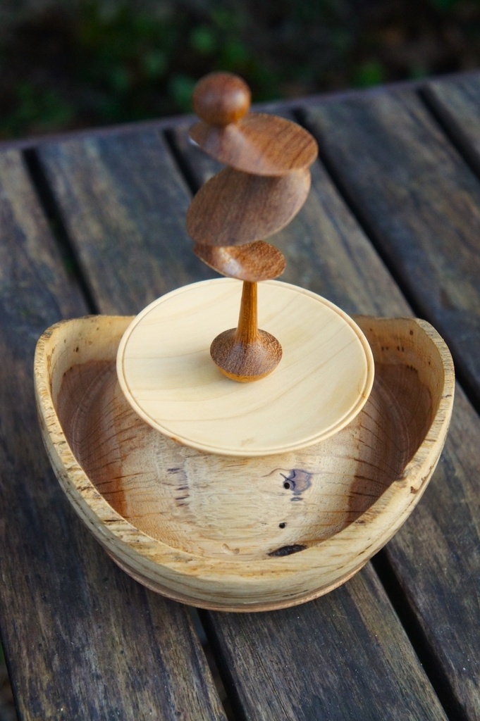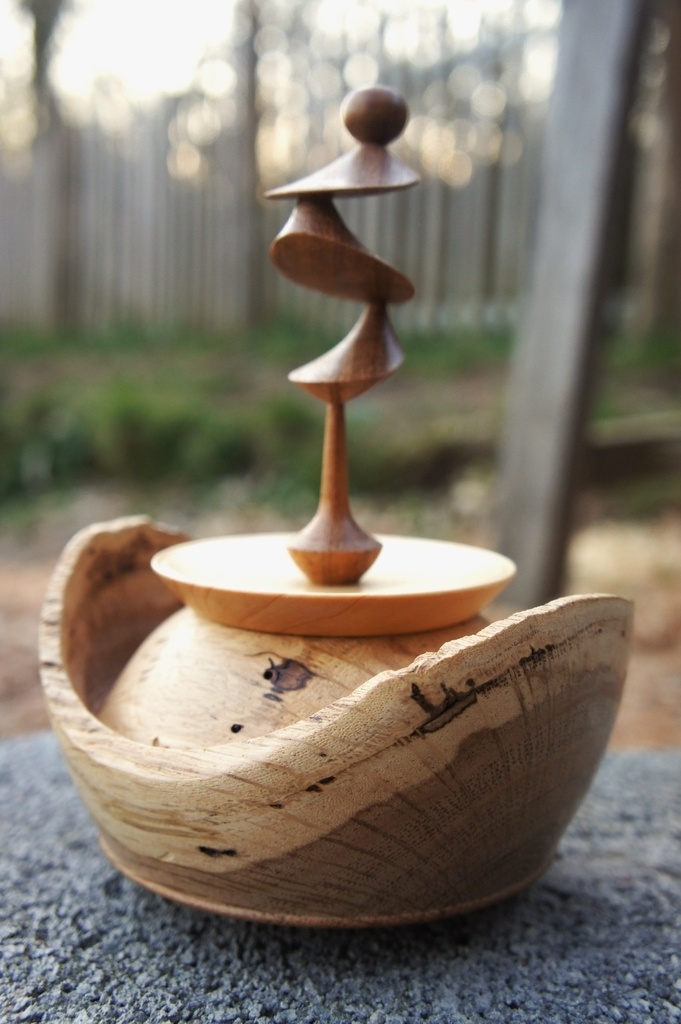 Bonjour, une boite en chêne, couvercle en cyprès, fleuron en iroko. Finition gomme laque. Un aperçu de ce que donne un tournage excentrique. Il ne faut pas trembler.