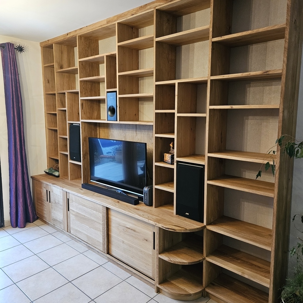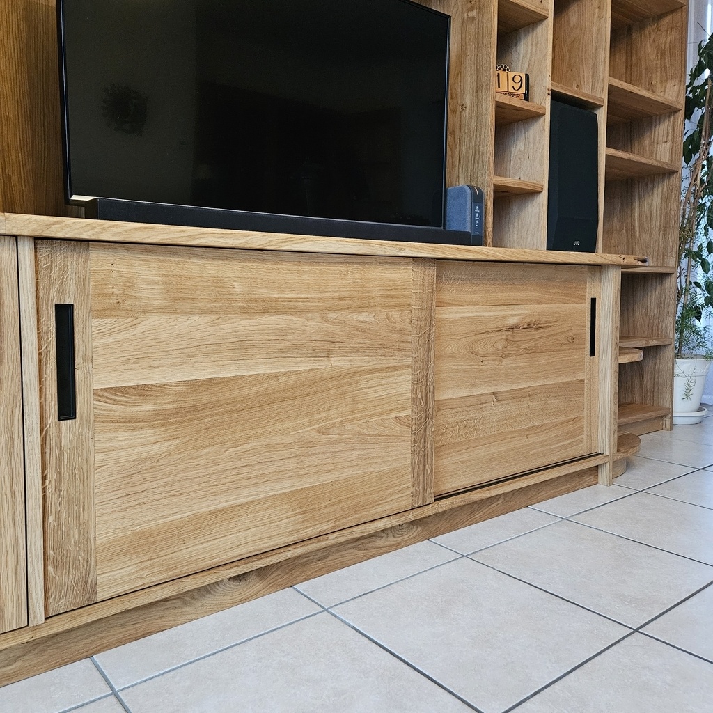 Meuble TV bibliothèque tout en chêne massif. Assemblages des différents panneaux en rainure et languette.