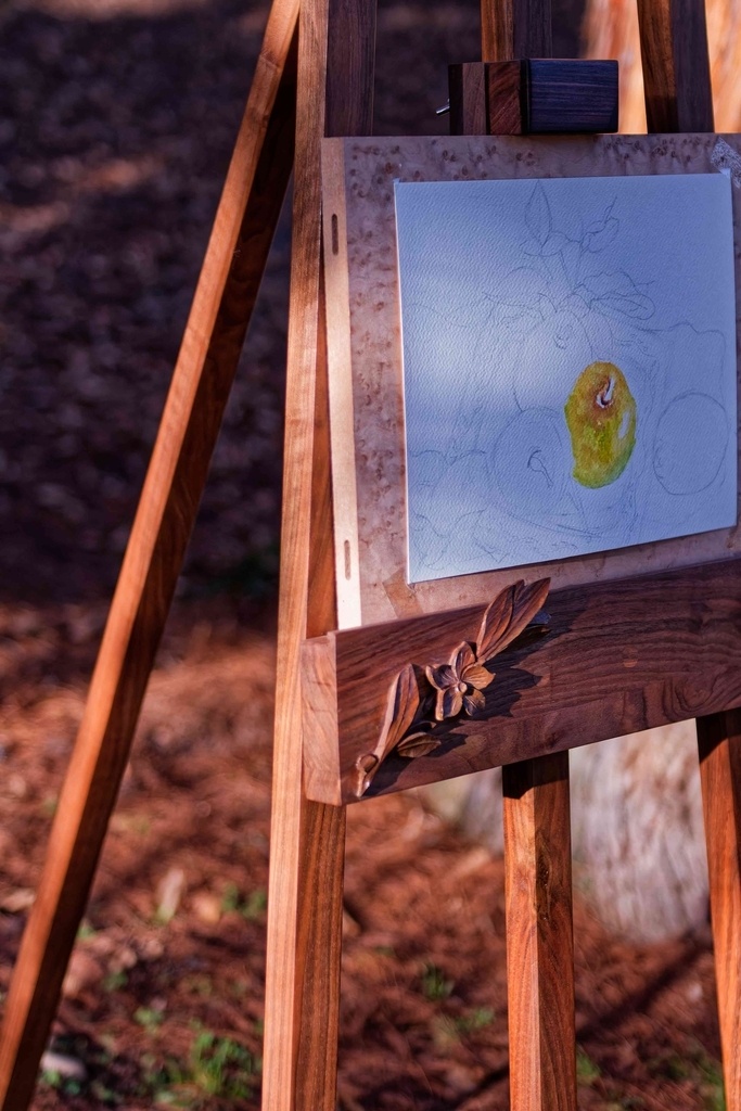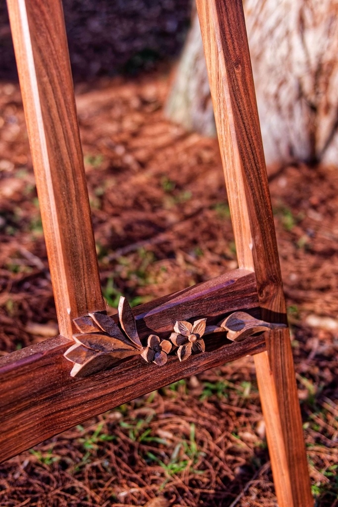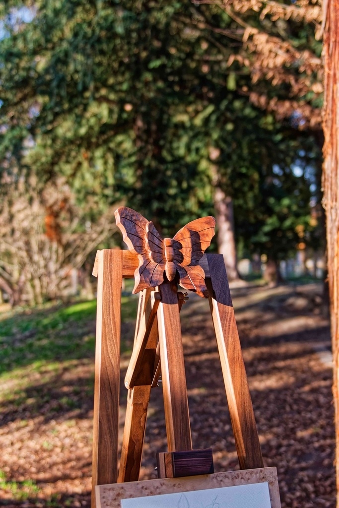 J'ai eu la chance de réaliser ce chevalet pour une artiste peintre, amatrice de fleurs et de papillons.