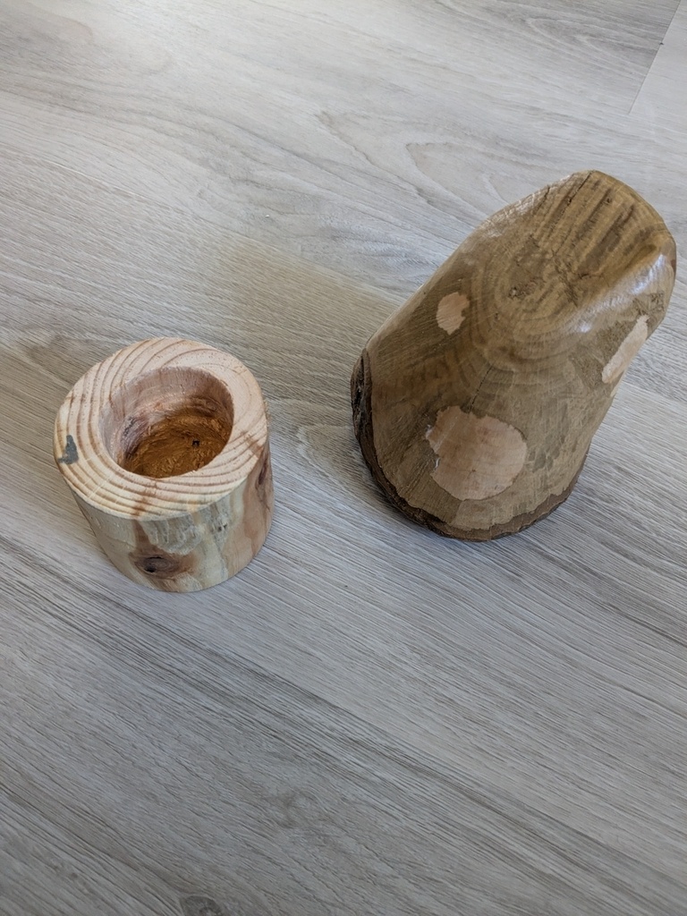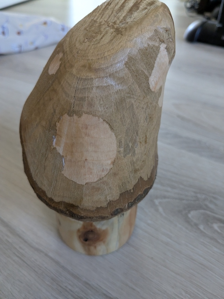 Le "chapeau" du champignon est du chêne (merci Ciaran), sculpté avec ce que j'ai pu : scie, gouge, couteau à sculpter, etc.