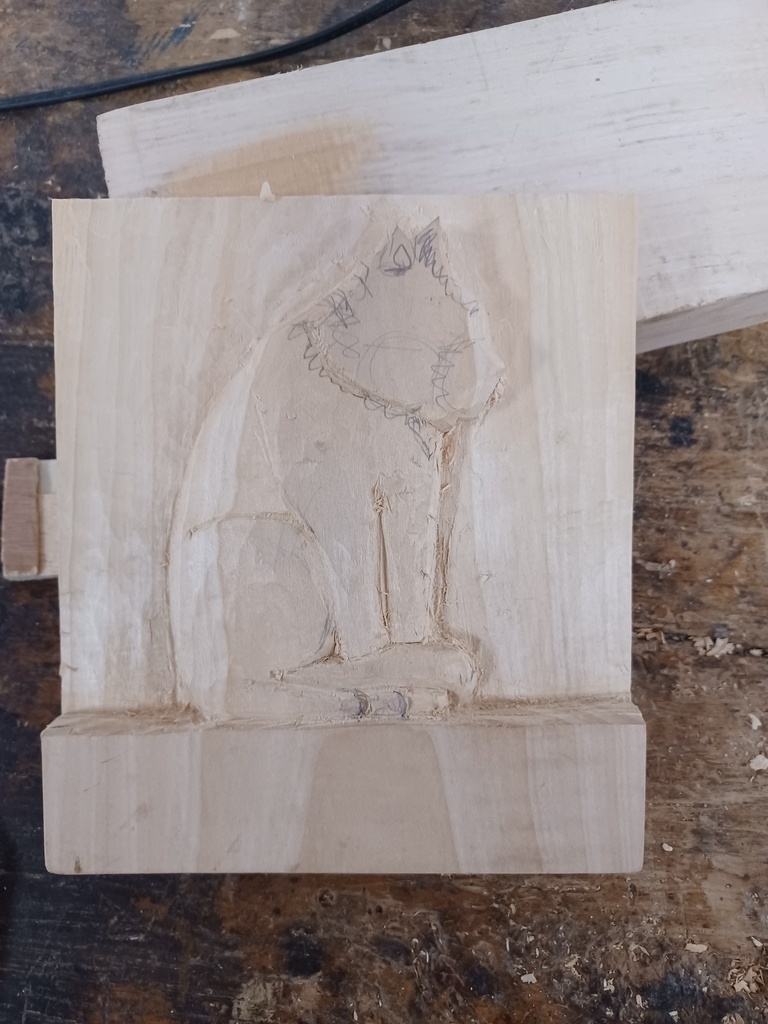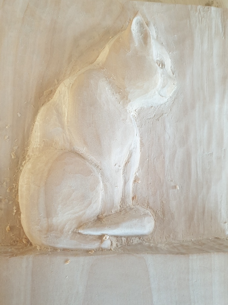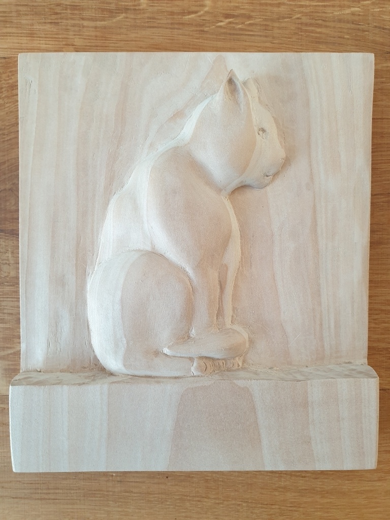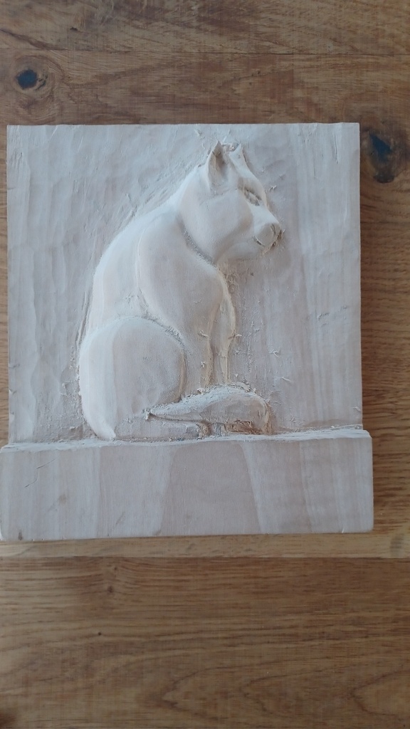 J'ai trouvé dans un bouquin, mis à disposition, une photo d'un chat que j'ai essayé de reproduire tant bien que mal sur une planche de tilleul.