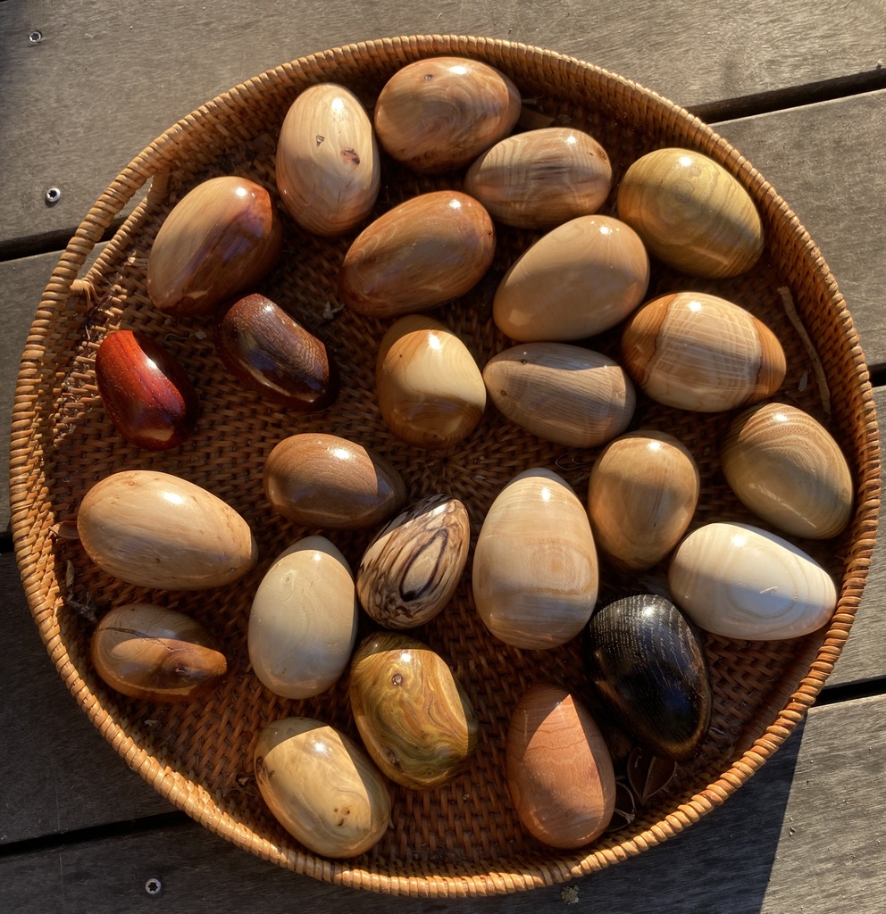 Quelques oeufs dans des bois que j'aime bien travailler. Je vous laisse deviner les essences. Finition vernis brillant à la bombe. Une façon plus esthétique de compléter ma xylothèque.
