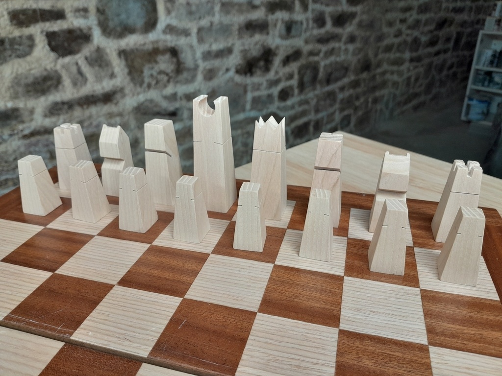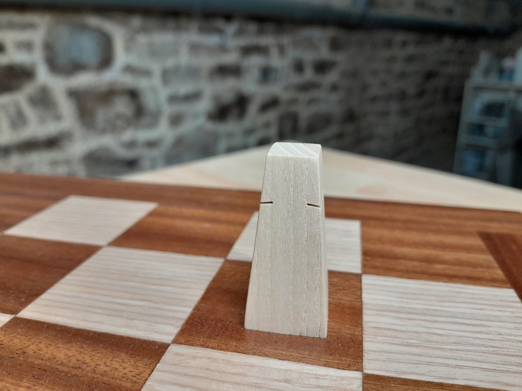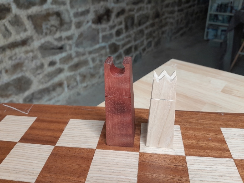 Je les ai mis en forme grossièrement à la scie à ruban, puis finition à la ponceuse à bande, puis abrasif à main grain fin notamment pour casser les arêtes. Les petites incisions sont faites à la scie à chantourner, les créneauxdes tours à la scie sur table, et la couronne du roi a été faite à la perceuse à colonne