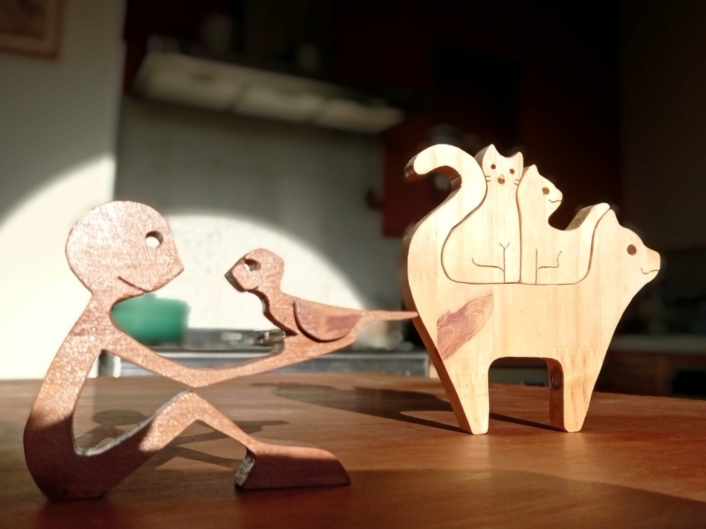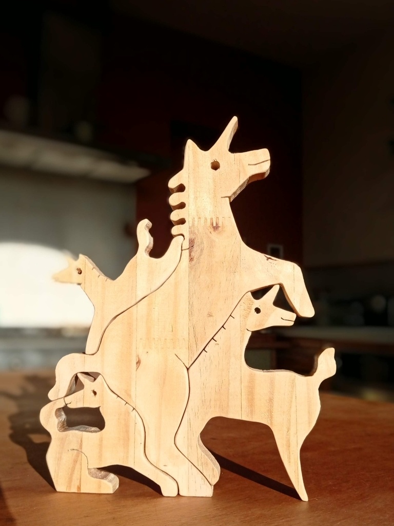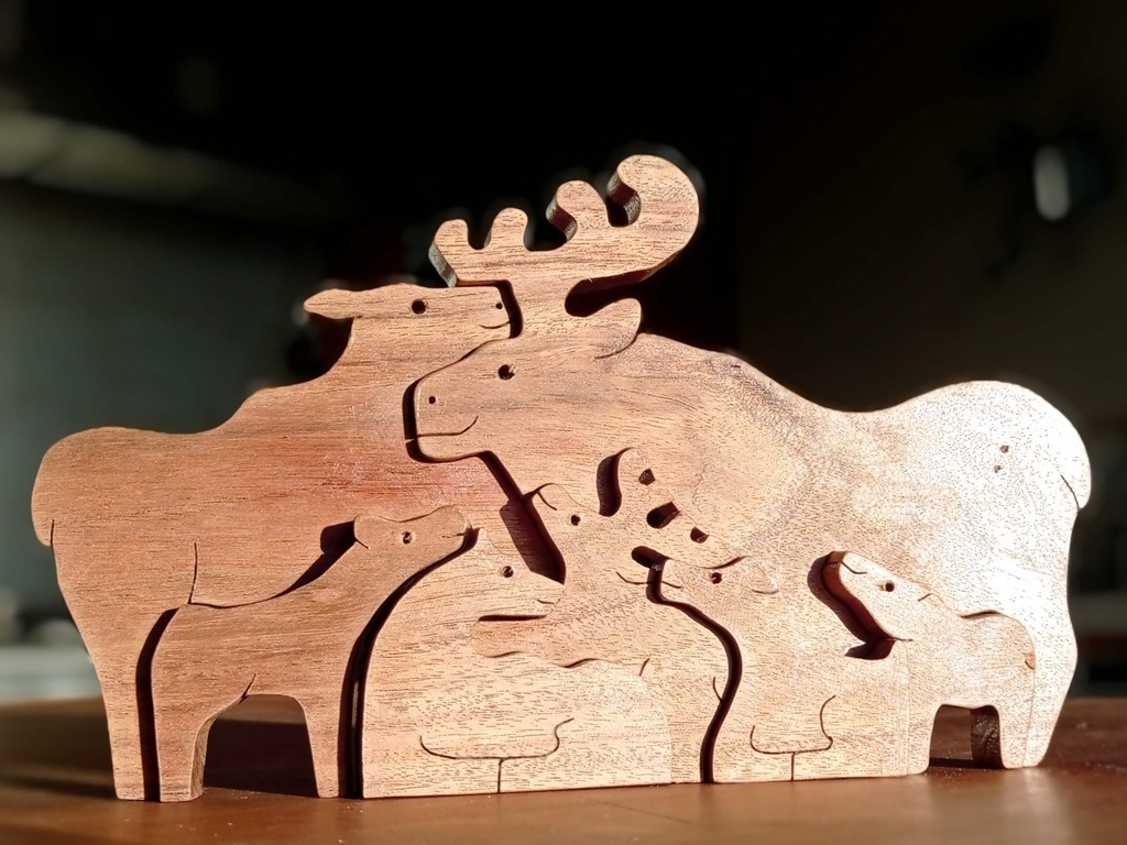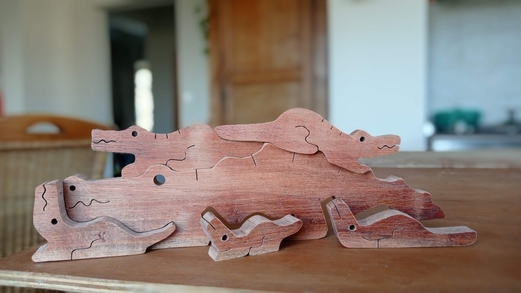 Les crocodiles et les élans sont en bois exotique inconnu récupéré sur un meuble ;