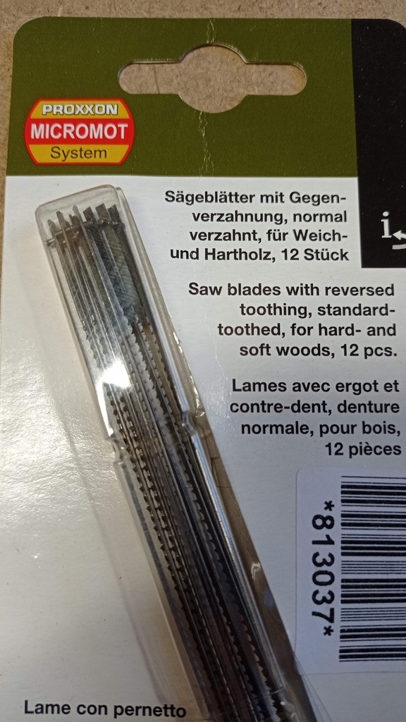 Bonjour, je met du scotch pour peinture sur les deux faces. J'utilise des lames proxxon avec ergot et double denture.