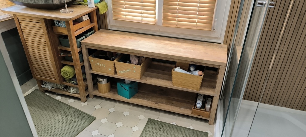 Banc / étagère réalisé en chêne massif.Huile Rubio smoke 5%Approuvé par le maitre de maison!