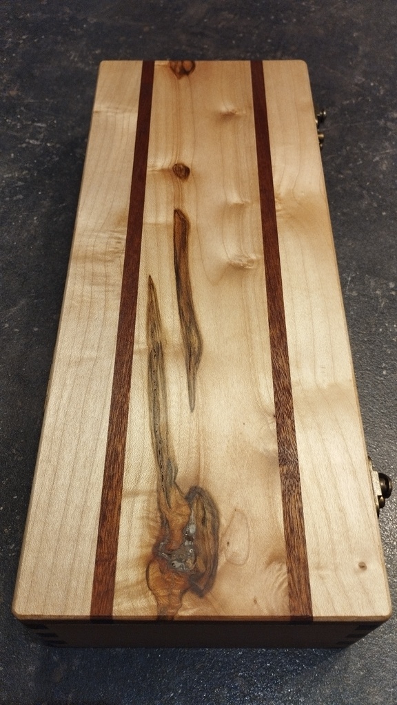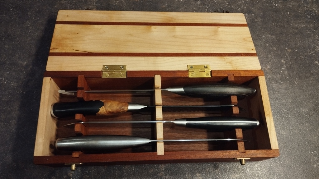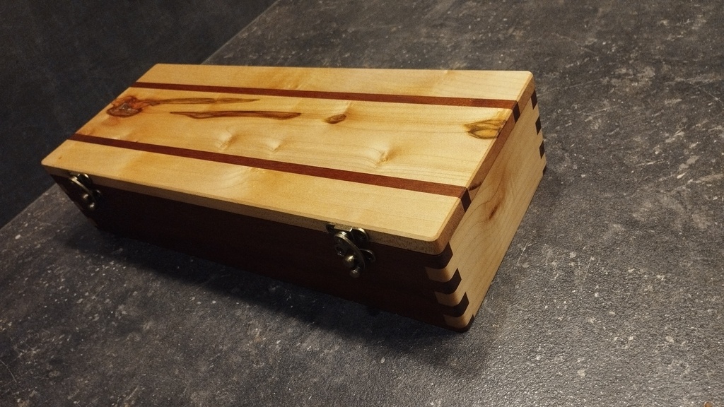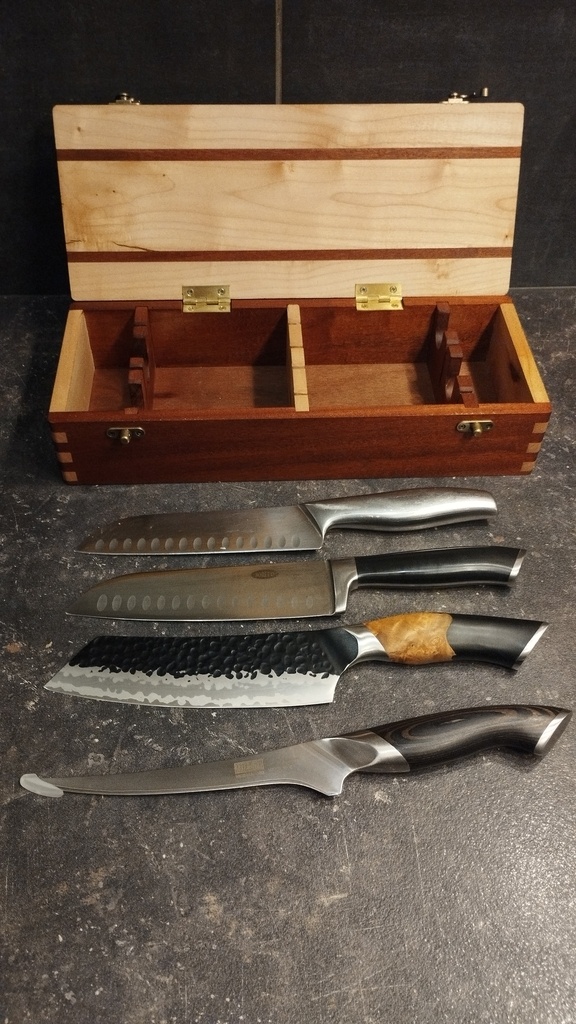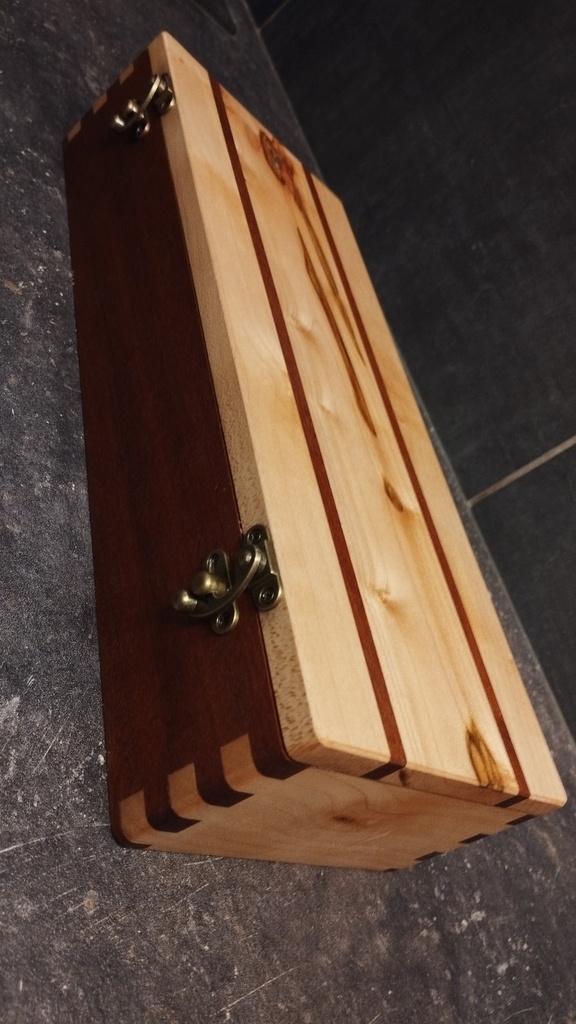 Petite boîte de rangement pour les couteaux de cuisine.Queue droite a la défonceuse et au gabarit,un peu de travail a la dremel et la scie a ruban pour les intercalaires et voilà tout .