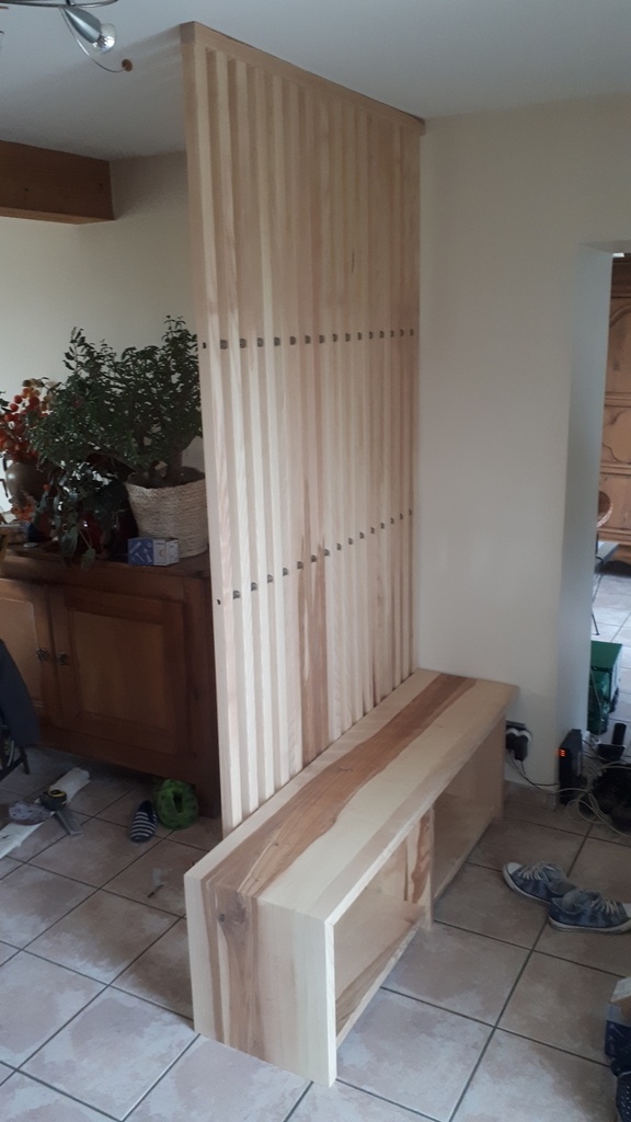 Un banc permettant de ranger les chaussures avec un petit coin box internet (contre le mur), et un claustra. Des patères ont été rajoutées par la suite pour suspendre des vêtements.