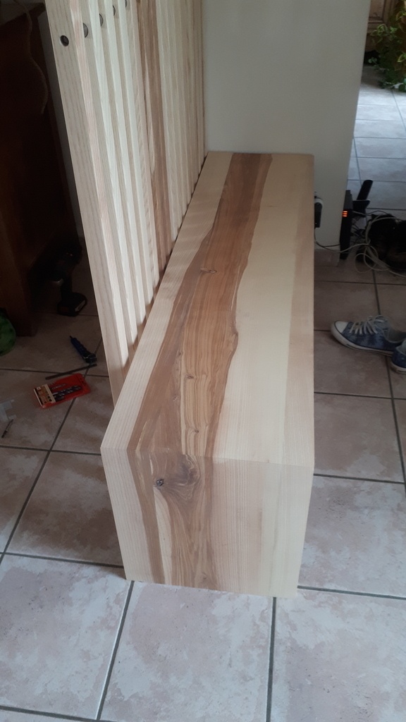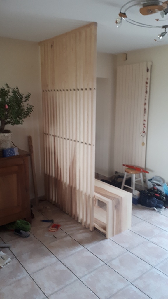 Les éléments de claustra sont fixés sur le banc en partie basse par vis + bouchons bois. En partie haute une traverse sert à la fixation des verticaux par une vis + domino. Cet élément est fixé dans le plafond par vis (plafond Fermacell). Deux "rangées" intermédiaires sur la hauteur ont été faite avec des morceaux de tube inox 19mm formant entretoises, et serrées par tige filetée traversante (avec un bouchon pour cacher par bout l'assemblage)