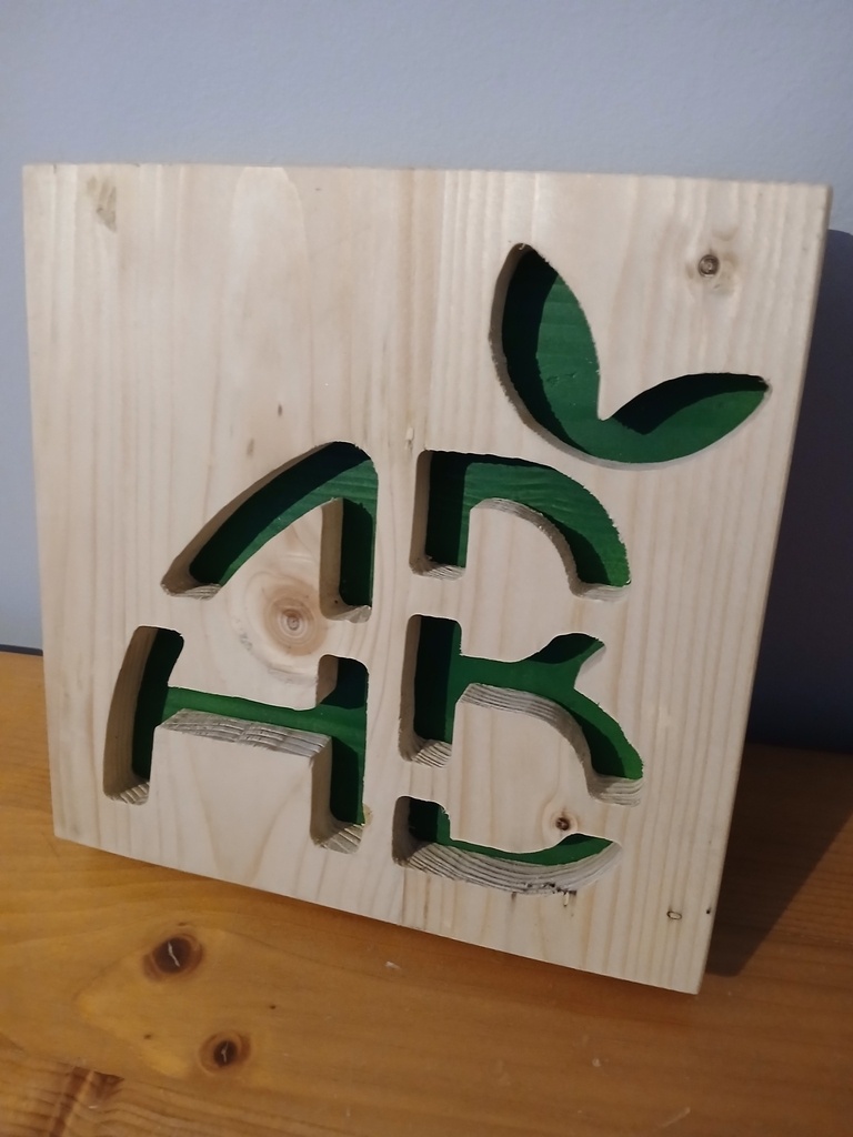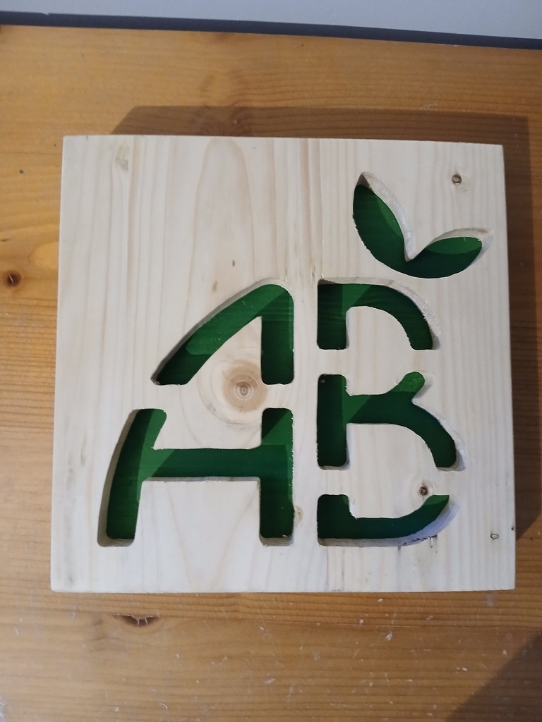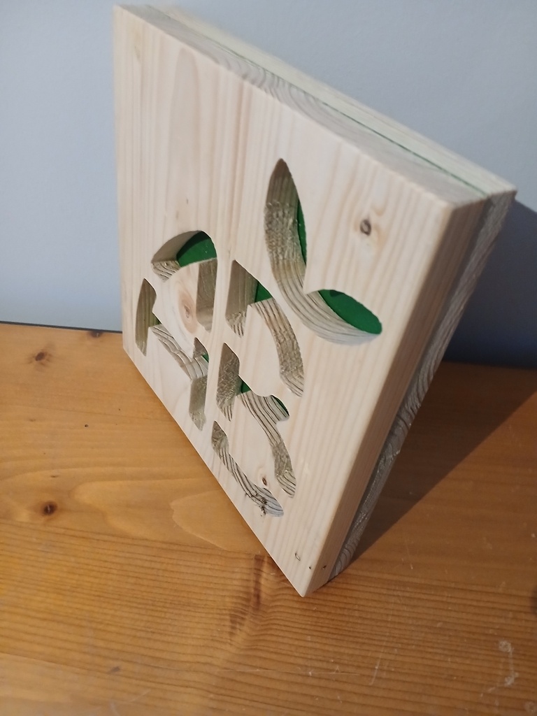 J'ai utilisé des planche de palette, que j'ai raboter puis collé. Avec mon imprimante 3D j'ai fait un gabarit, après avoir usine le logo, je passe au ponçage puis peinture pour le fond en vert vernis l'autre pièce est assemblée et dernier vernis