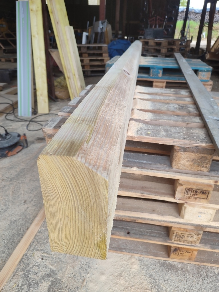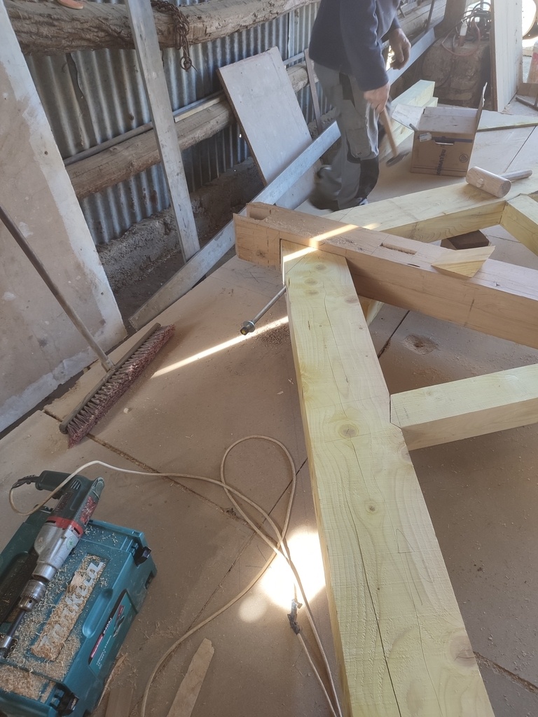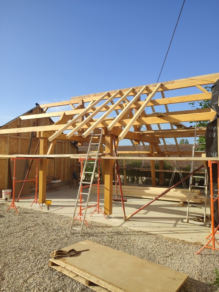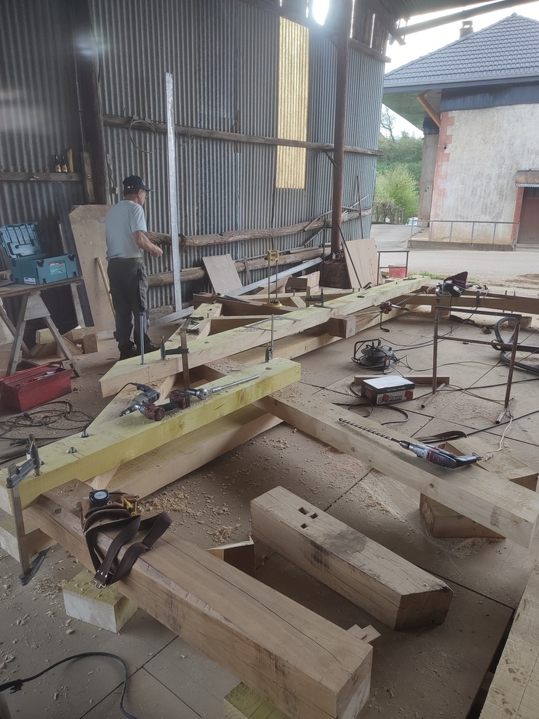 J'ai fait la charpente en sapin et les poteaux en chêne, moi-même abattu les arbres et scié les grumes. (poteaux seulement) Le reste a été fait sur liste par des scieurs.