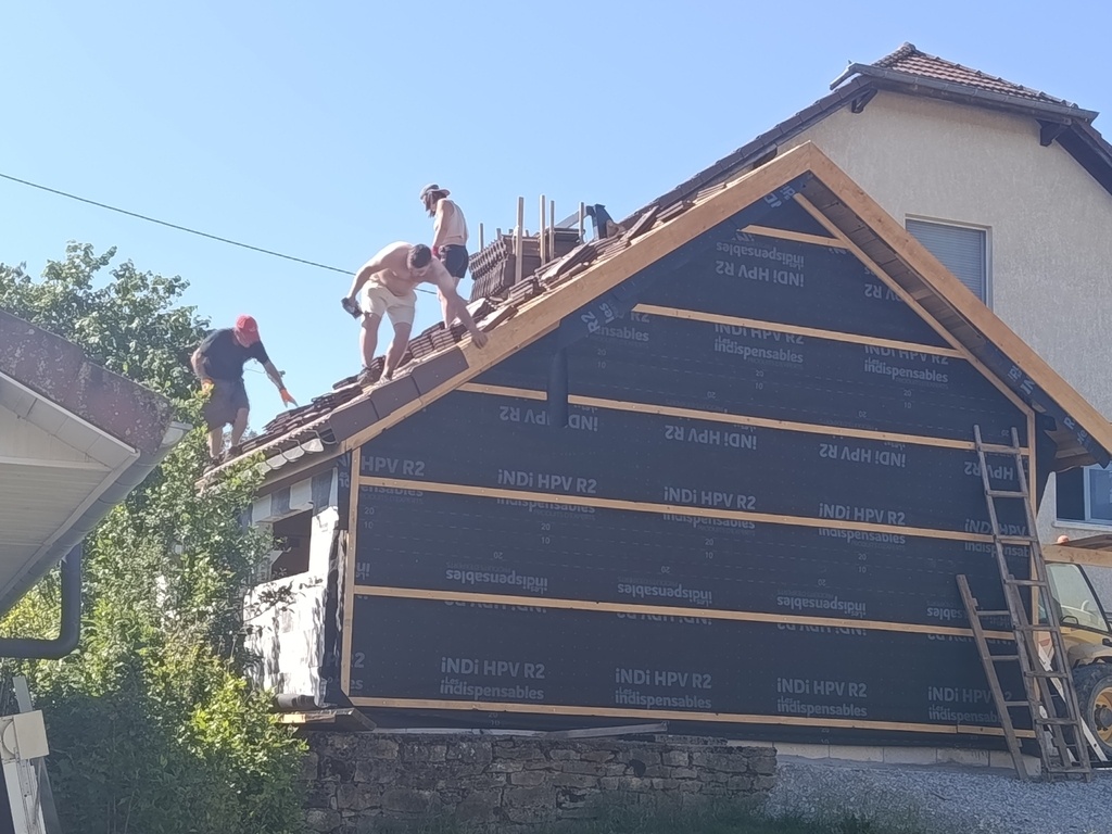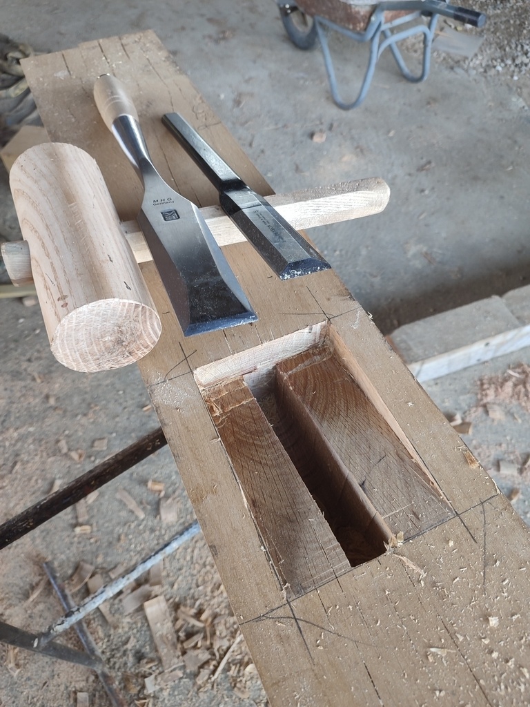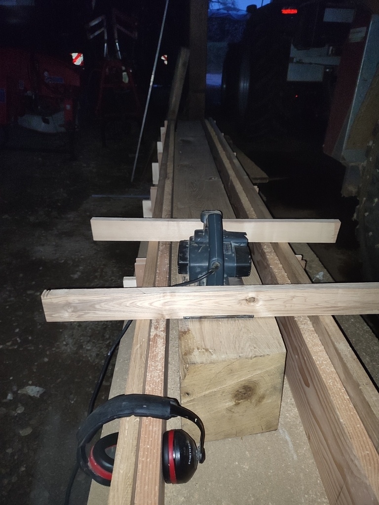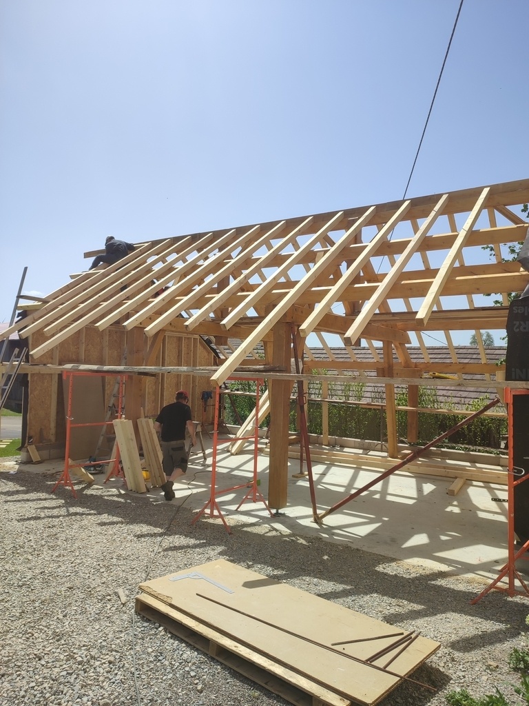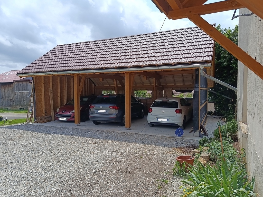 J'ai fait la charpente en sapin et les poteaux en chêne, moi-même abattu les arbres et scié les grumes. (poteaux seulement) Le reste a été fait sur liste par des scieurs.