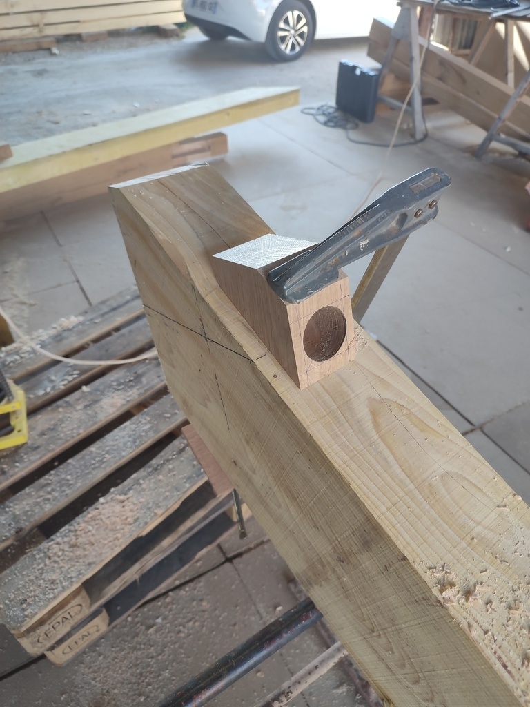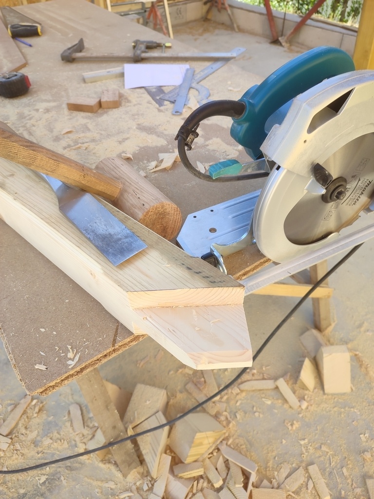 Traçage d'une épure au sol et piquage des bois au fils a plombs, le bois n'a pas été raboter.