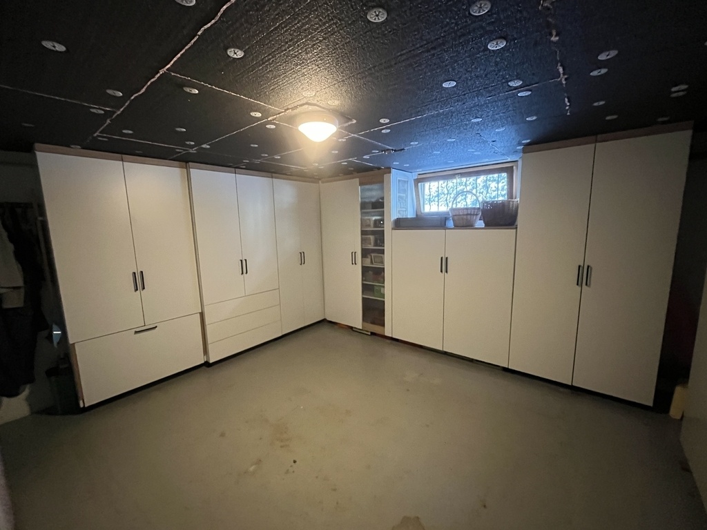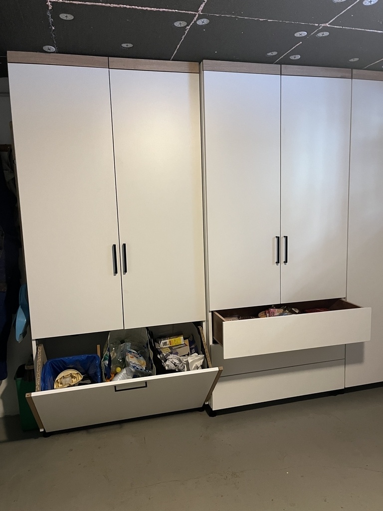 Aménagement de ma cave en cellier XL. En mélaminé blanc avec en zone déchet, tiroir pusch to open et un module pour les produits frais avec grillage de ventilation.