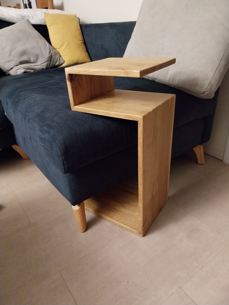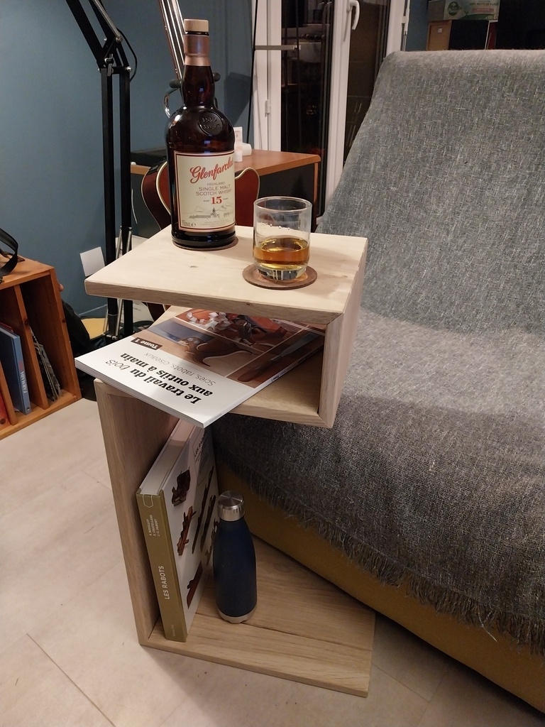 L’idée de base était d’avoir une mini table pour poser la bière et les caouettes. Il fallait pouvoir la laisser à coté ou la faire passer au-dessus de l’assise du canapé ou du fauteuil qui ne sont pas à la même hauteur.