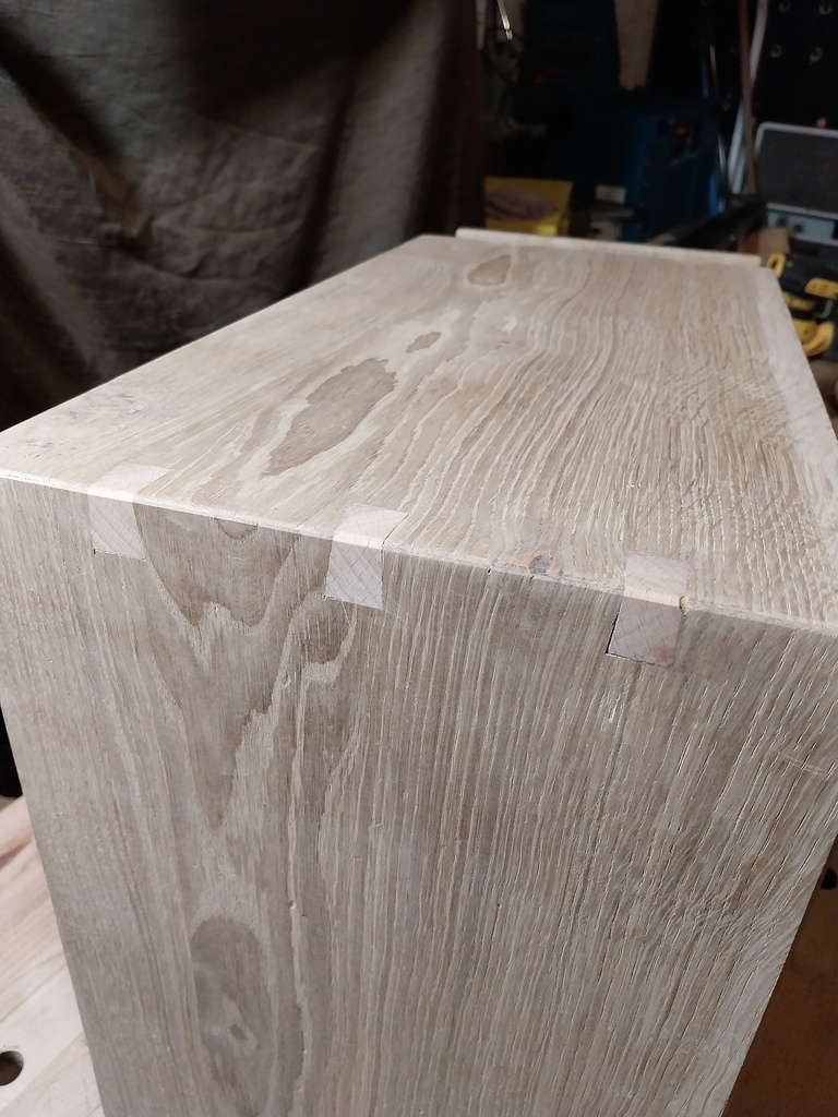 Je voulais faire un plateau assez long pour conserver le fil tout du long, donc de faire un assemblage à 45°. J’ai quand même réussi à inverser un des morceaux au collage. Puis j’ai eu peur que le collage à 45 sans dominos ne soit pas assez solide, alors j’ai fait des fausses queues d’arondes (je ne sais pas si ça porte un nom) à la main.