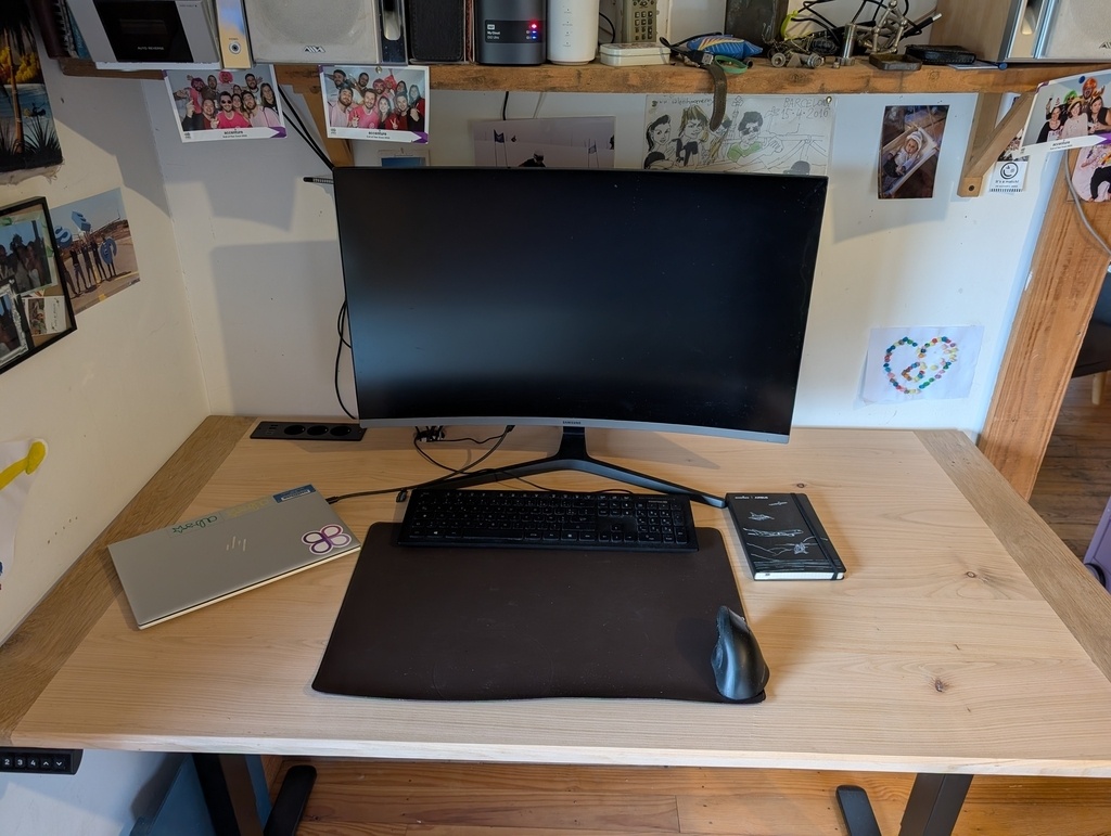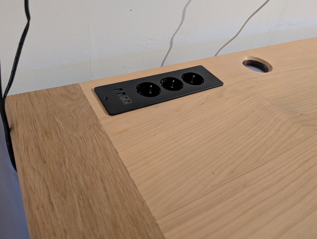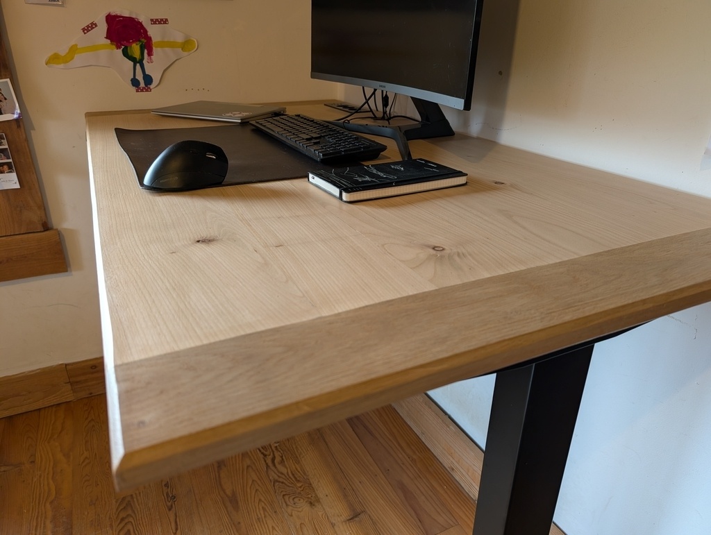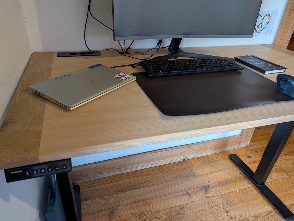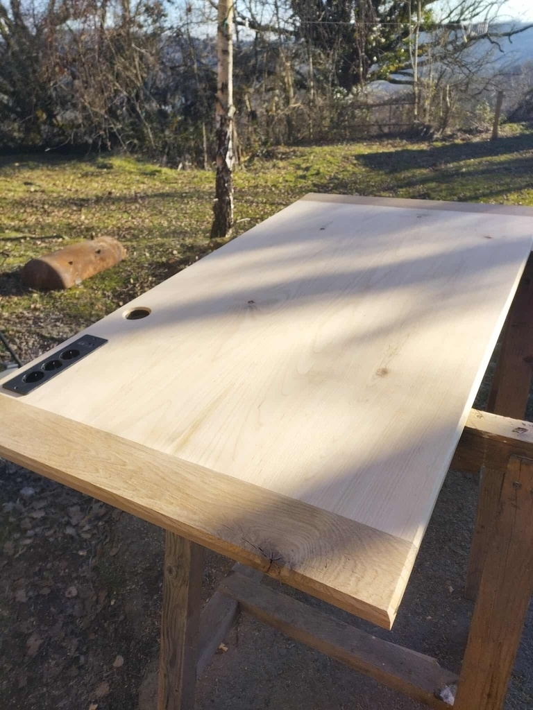 Plateau de bureau en merisier et chêne sur un piètement qui monte et descend, pratique quand on passe de longues heures derrière un écran :)