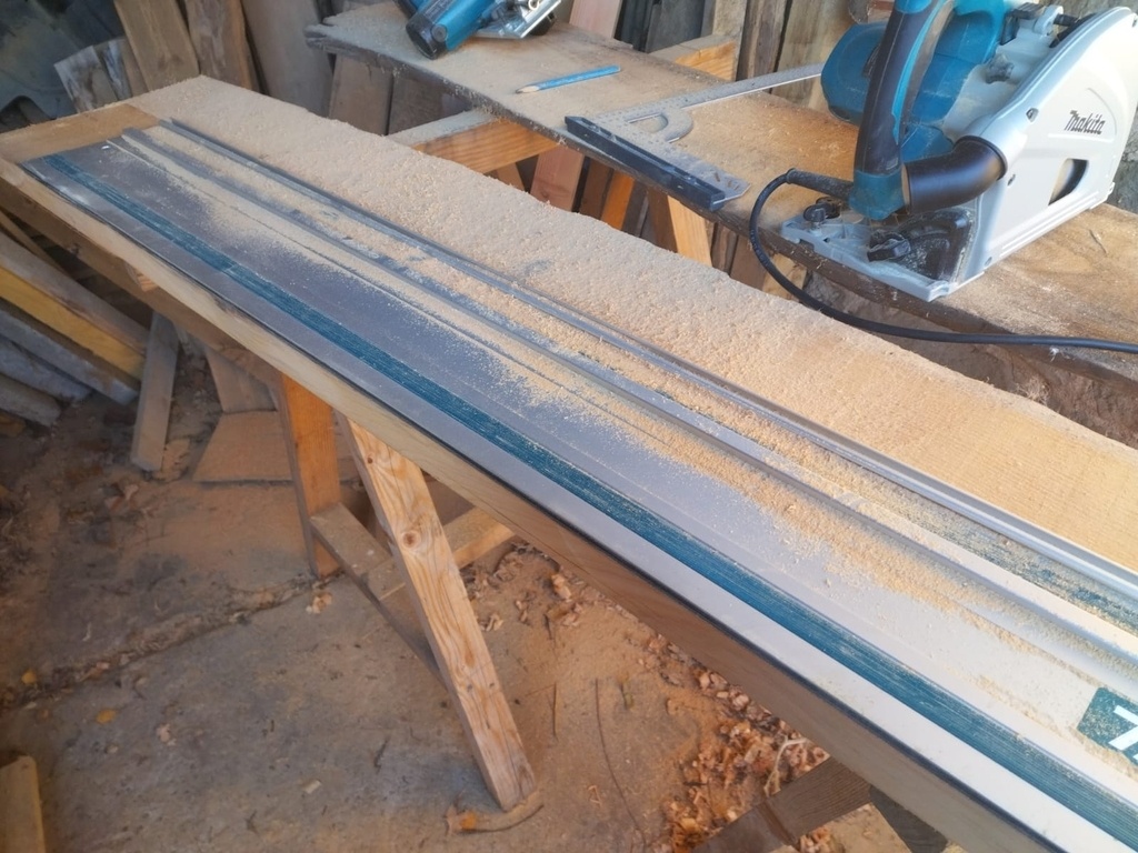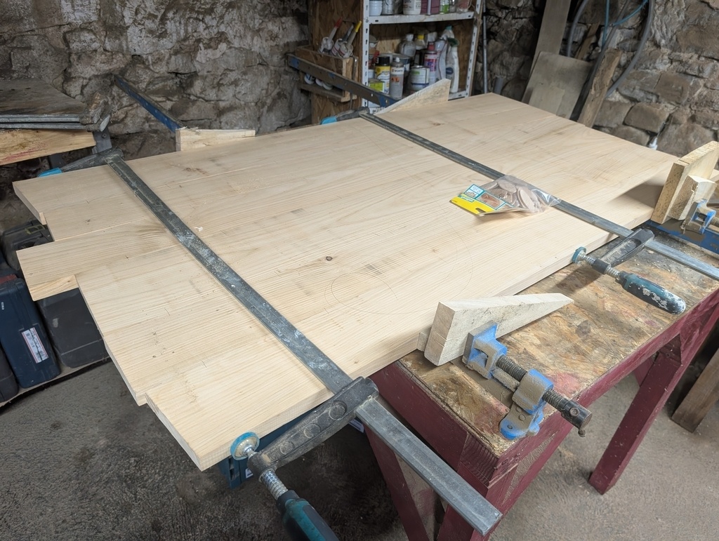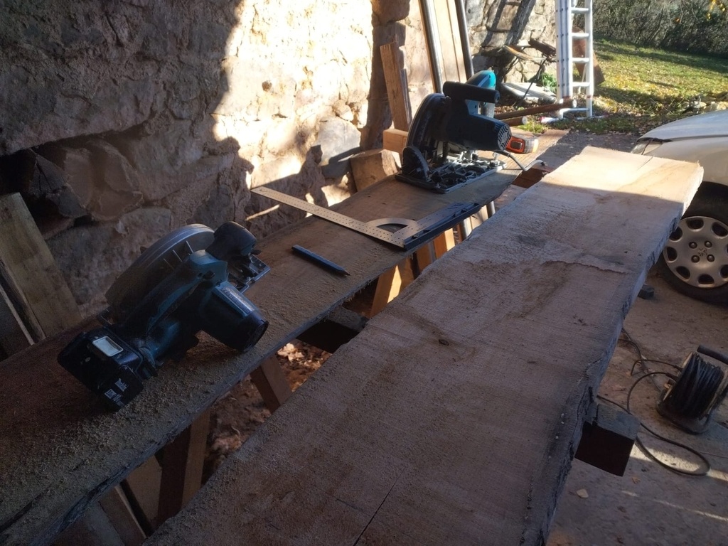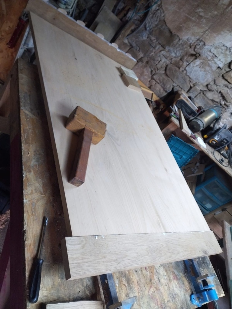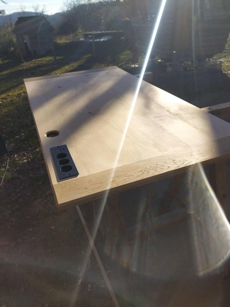 Plateau de bureau en merisier et chêne sur un piètement qui monte et descend, pratique quand on passe de longues heures derrière un écran :)