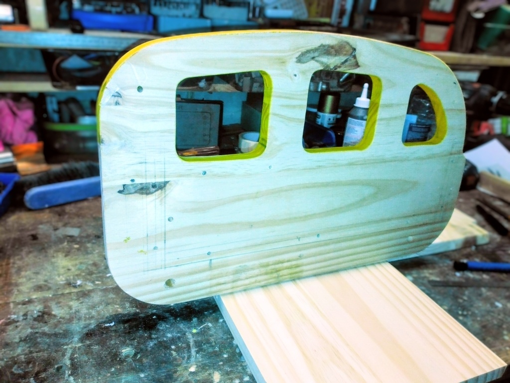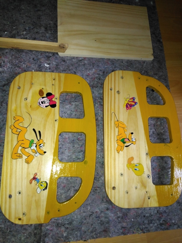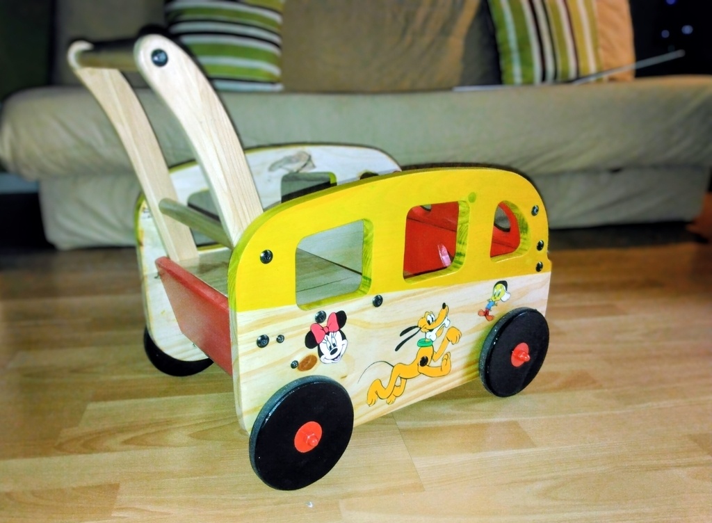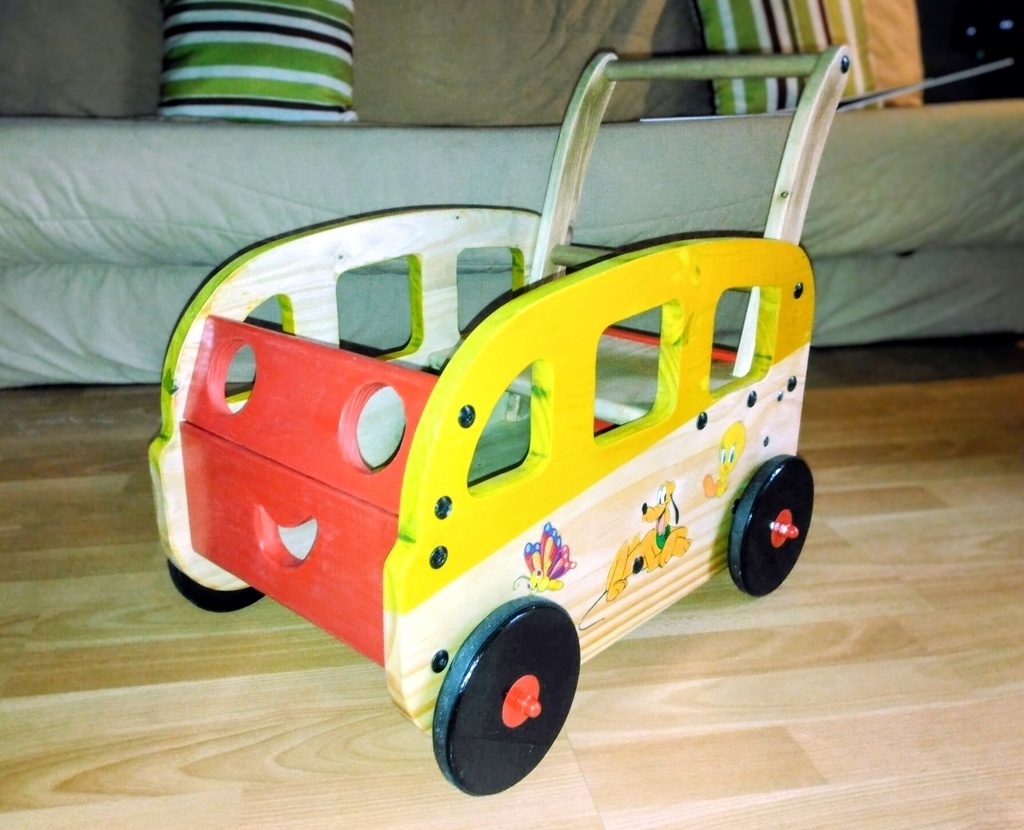 structure réalisée en pin ,les 4 roues en contre plaqué,une tige filetée ,un tube alu 8/10, des rondelles acier et rondelle en feutre ,le tout assemblée et serré modérement pour obtenir un freinage sur l'ensemble des 4 roues.