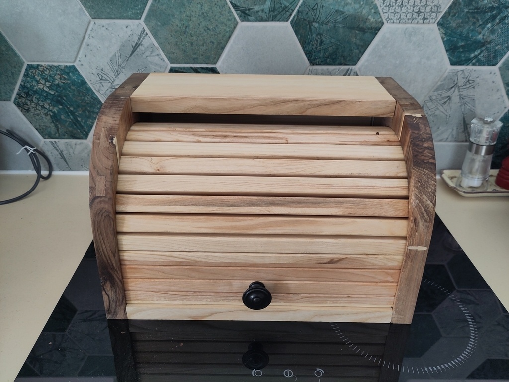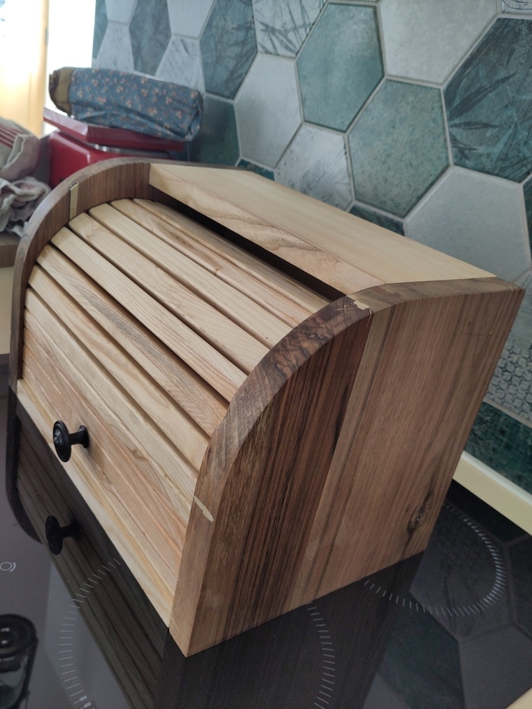 Voici une petit huche à pain faite à partir de chutes de noyer et de frêne trouvées dans l'atelier.