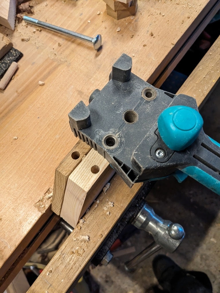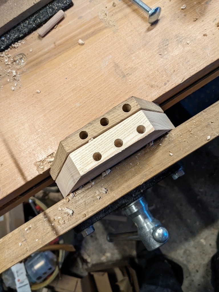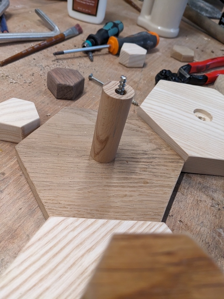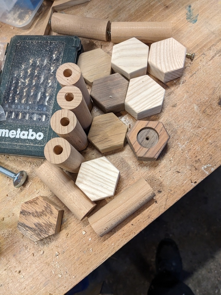Les tiges sont faites d'un tourillon hêtre de 22mm percé sur toute la longueur pour que l'ensemble grand hexagone-tourillon-petit hexagone soit tenu par une vis de 80mm, en plus du collage dans l'encastrement.