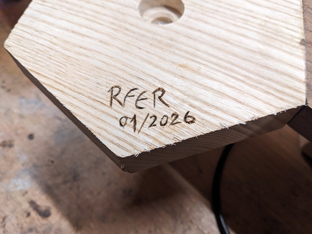 Signature au cutter à ultrason : ça rentre comme dans du beurre, et si on va trop lentement, le bois brûle un peu. Technique à peaufiner mais j'aime ce rendu.
