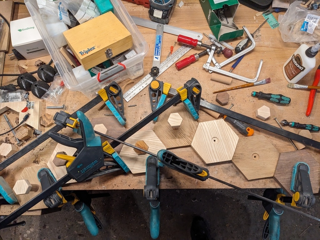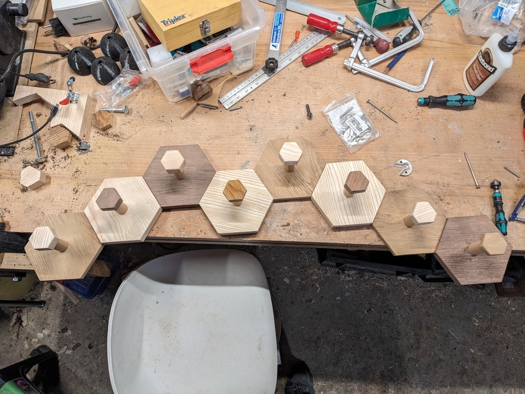 Patère pour l'anniversaire de mon petite frère. Fait de 8 hexagones de 13cm de côté, assemblage par tourillons de 8mm. J'ai utilisé du chêne, du frêne et du bois exotique pour les 3 couleurs. Ce dernier provient d'une vieille chaise malgache cassée (oui, encore !).