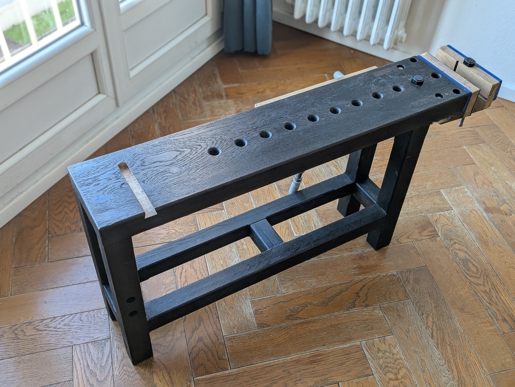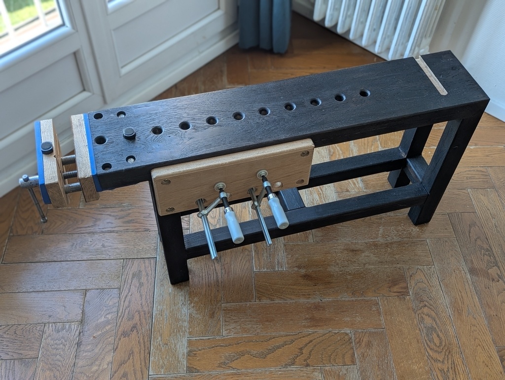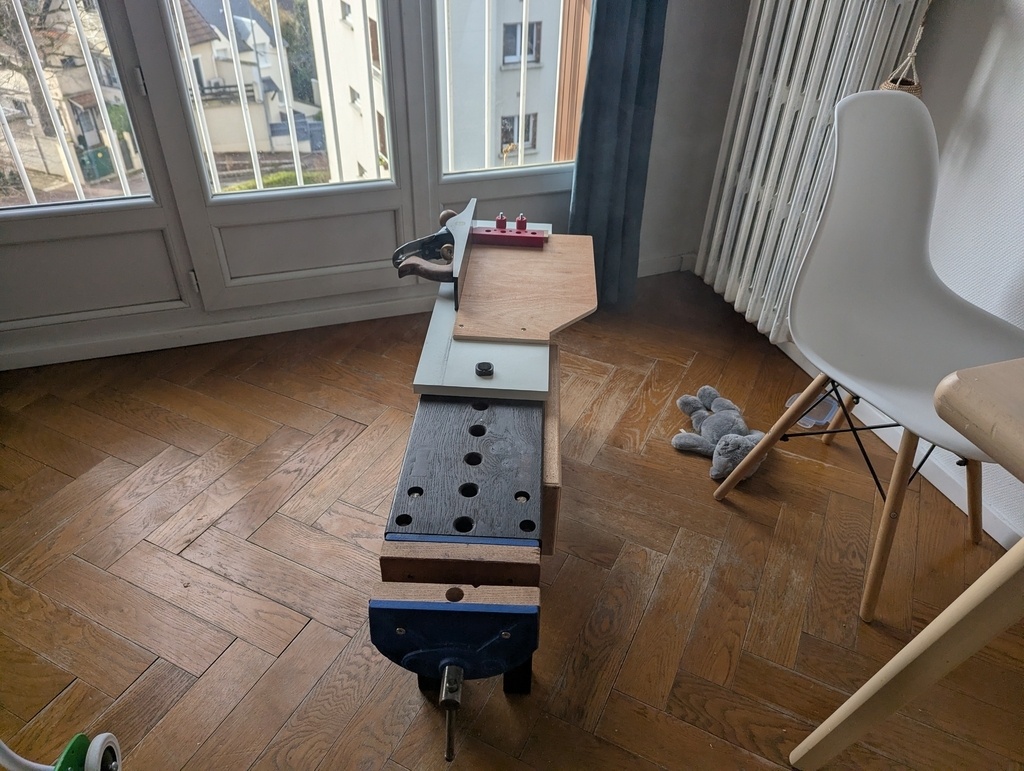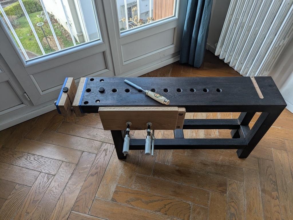 Petit établi d’appartement (100x20x51), né d’un manque cruel de copeaux et d’odeur de chêne en région parisienne.