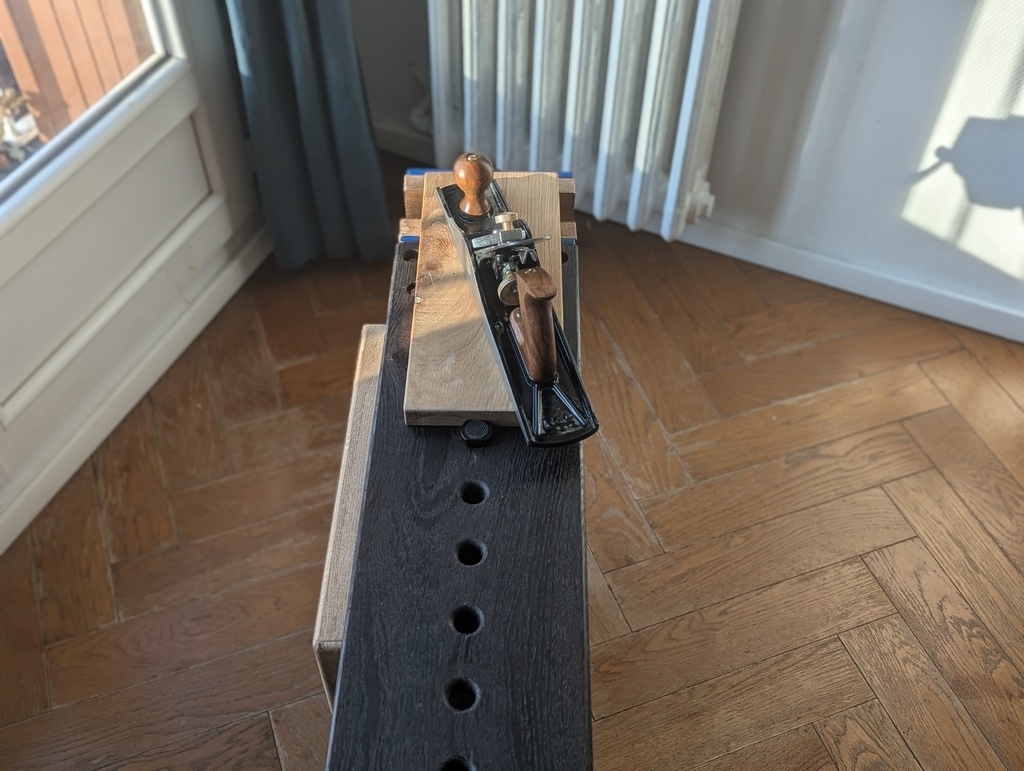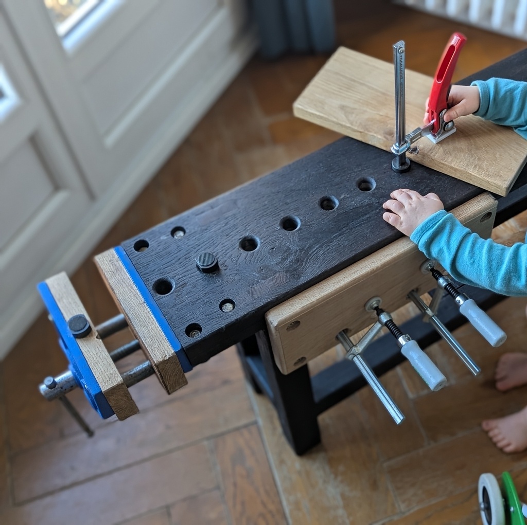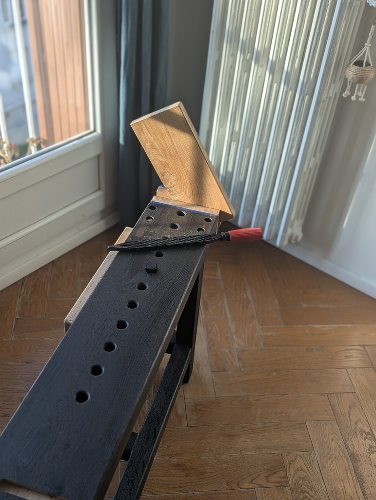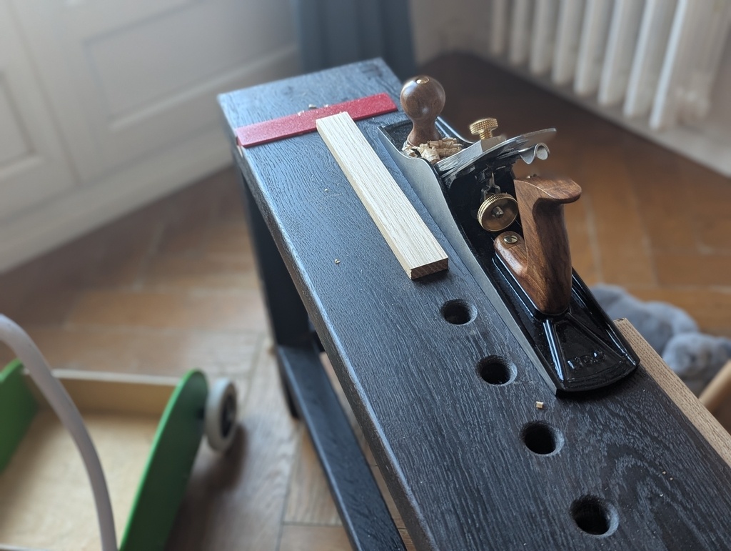 Petit établi d’appartement (100x20x51), né d’un manque cruel de copeaux et d’odeur de chêne en région parisienne.