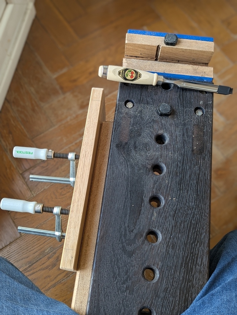 Je me suis foiré sur deux tenons (je devais pas avoir les yeux en face des trous). Pas très grave, il n'est pas fragilisé, juste un épaulement qui n'est pas parfait à deux endroits.