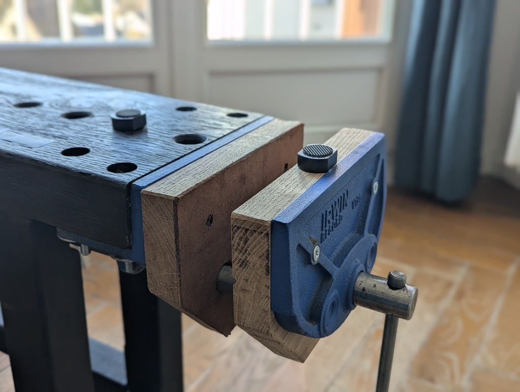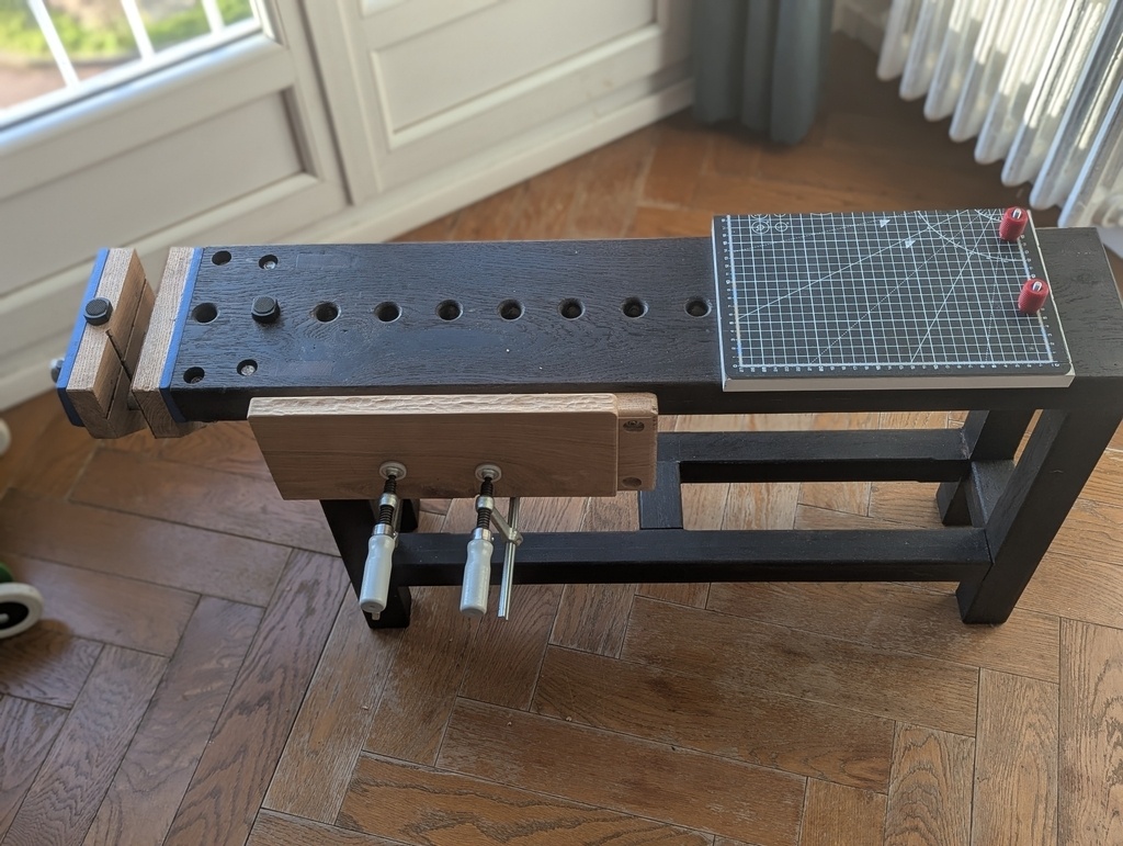 Sa hauteur est de 51 cm (1m de long, 20 de large, 1m10/15 étau ouvert), et l'épaisseur du plateau est d’environ 5 cm, les pieds et les traverses font 4.5cm. J’ai obtenu cette épaisseur par collage, en utilisant que des chutes. L’espacement entre les pieds est de 90 cm. Il est vraiment très ressemblant à celui de Philoa et d’Octavian Dan.