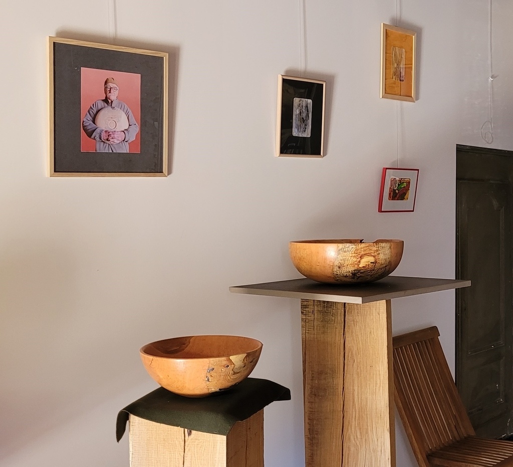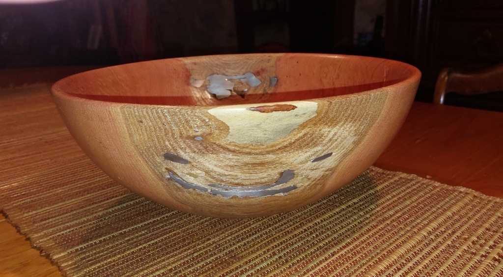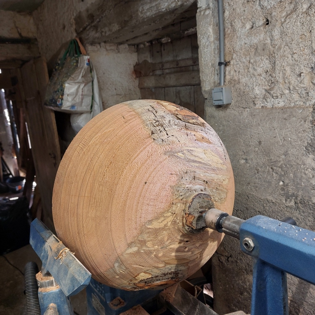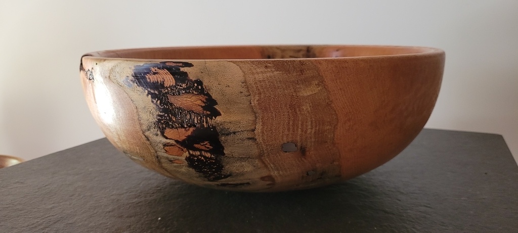 Il s'agit de deux coupes imposantes (395 et 330 mm de diamètre). Le bois, 25 ans de séchage, un robinier aux couleurs rose-orangé, provient d'un arbre abattu sur une allée de château. De gros vers ont fait leur vie dans l'épaisse écorce et l'aubier. Au tournage, d’étonnantes couleurs se sont révélées et j'ai alors fait le choix de conserver les zones attaquées par les vers et de combler les cavités par de l'étain.