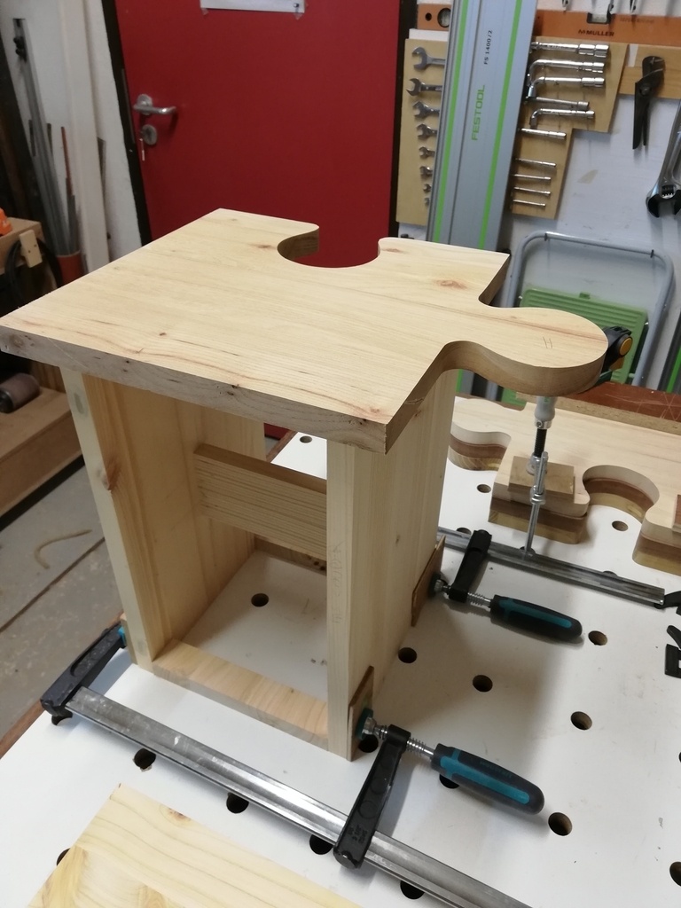 - assise : assemblage des bois, découpe grossière à la scie sauteuse, copie à la défonceuse avec fraise à copier à partir de mon gabarit "puzzle"
