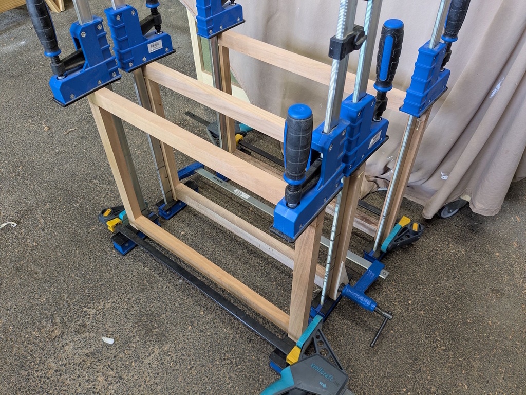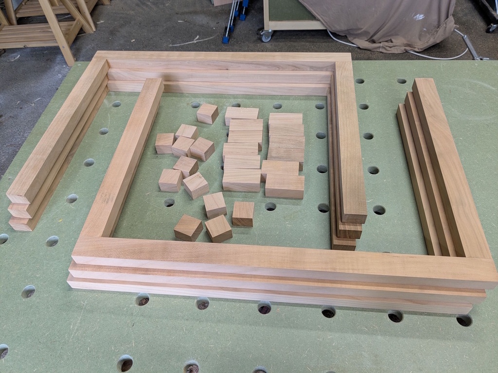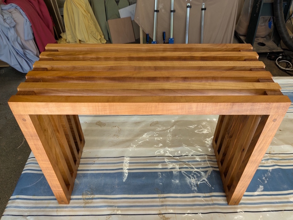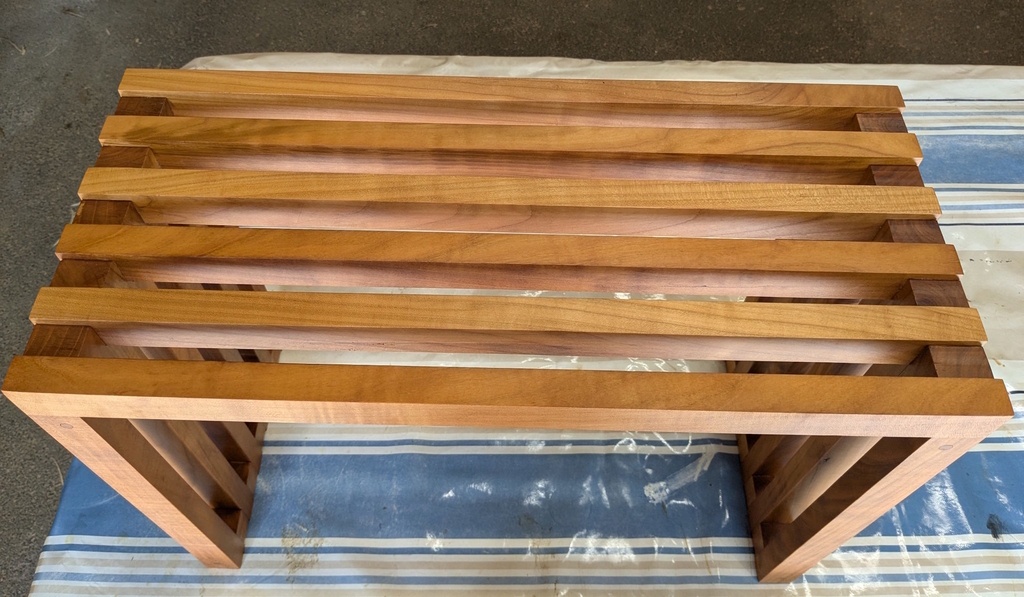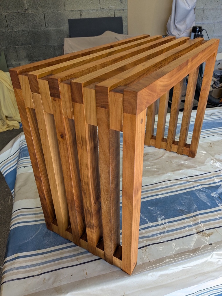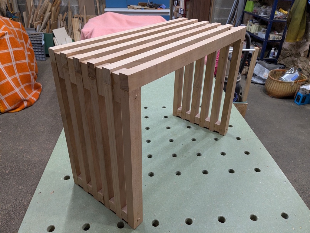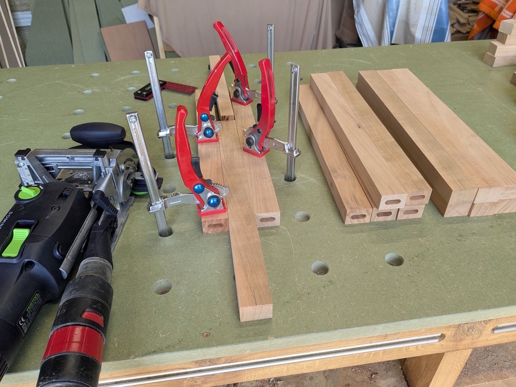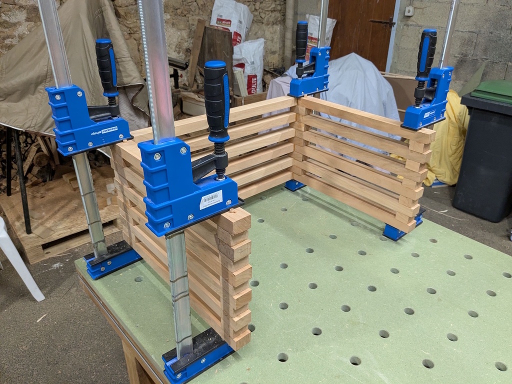 Premier essai pour ce type de banc, avec une mauvaise idée ou réalisation de ma part : faire l'alignement des cadres et "intercalaires" avec des tourillons. Mes perçages n'étaient pas correctement alignés et il ne faut pas y regarder de trop près ;)