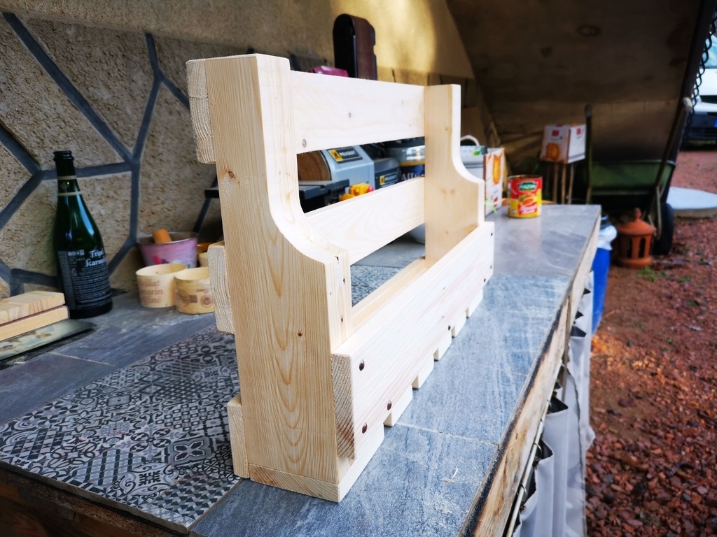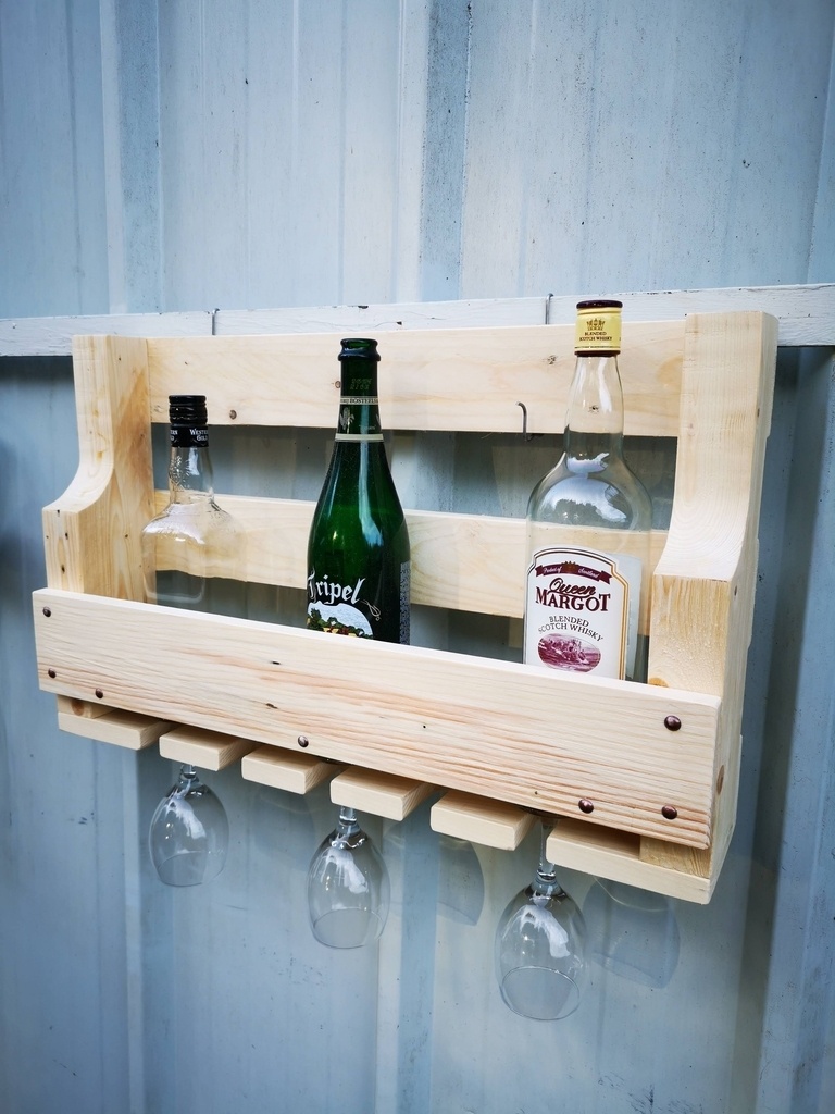 voici une étagère bois porte bouteilles et verres , 5 bouteilles et 5 verres