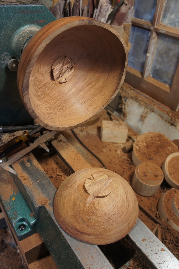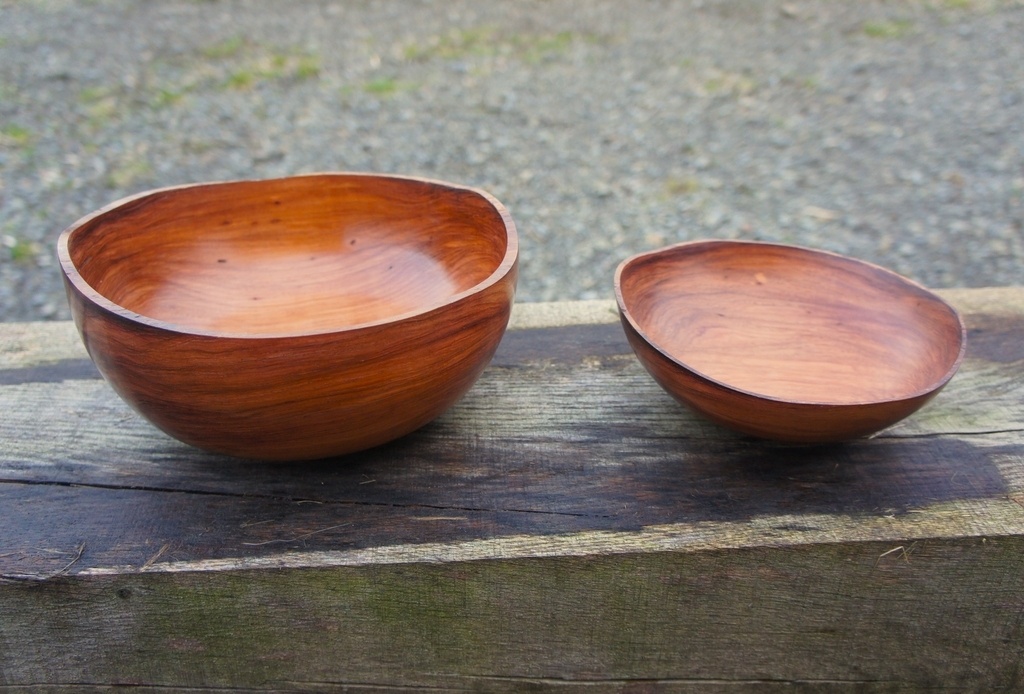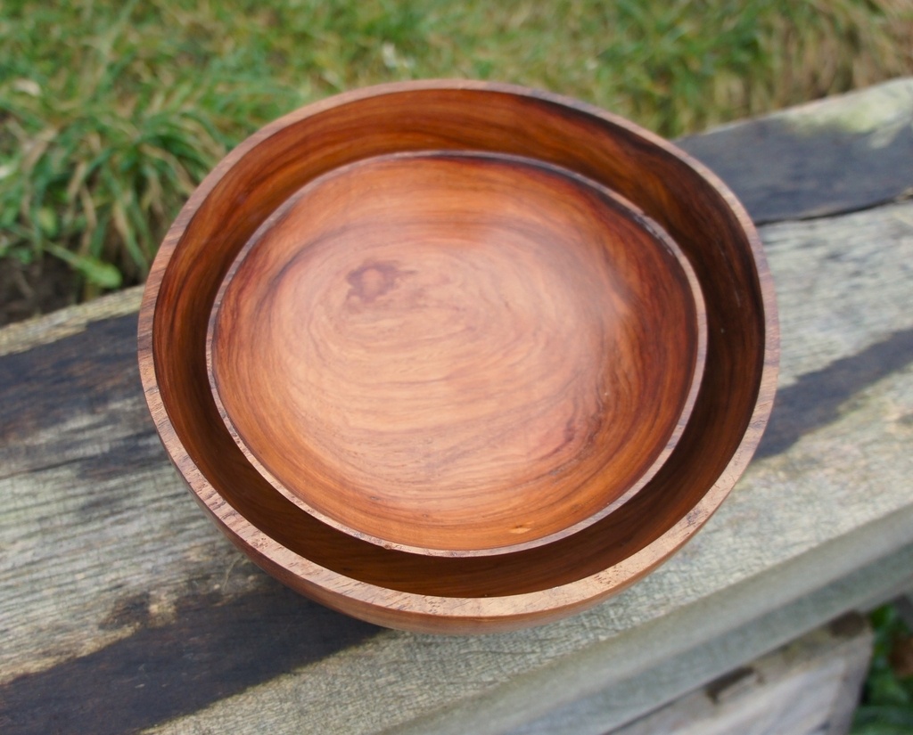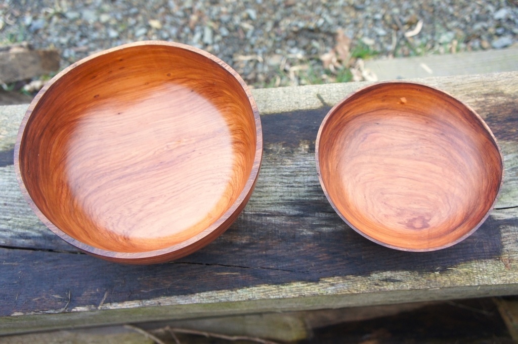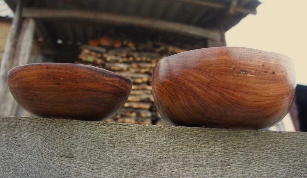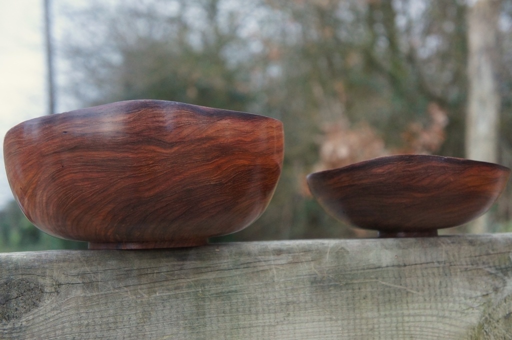Bonjour, un set de bols en je ne sais trop quelle essence. Récupération de la chute au creusage pour faire le deuxième. La finition est faite à la gomme laque.