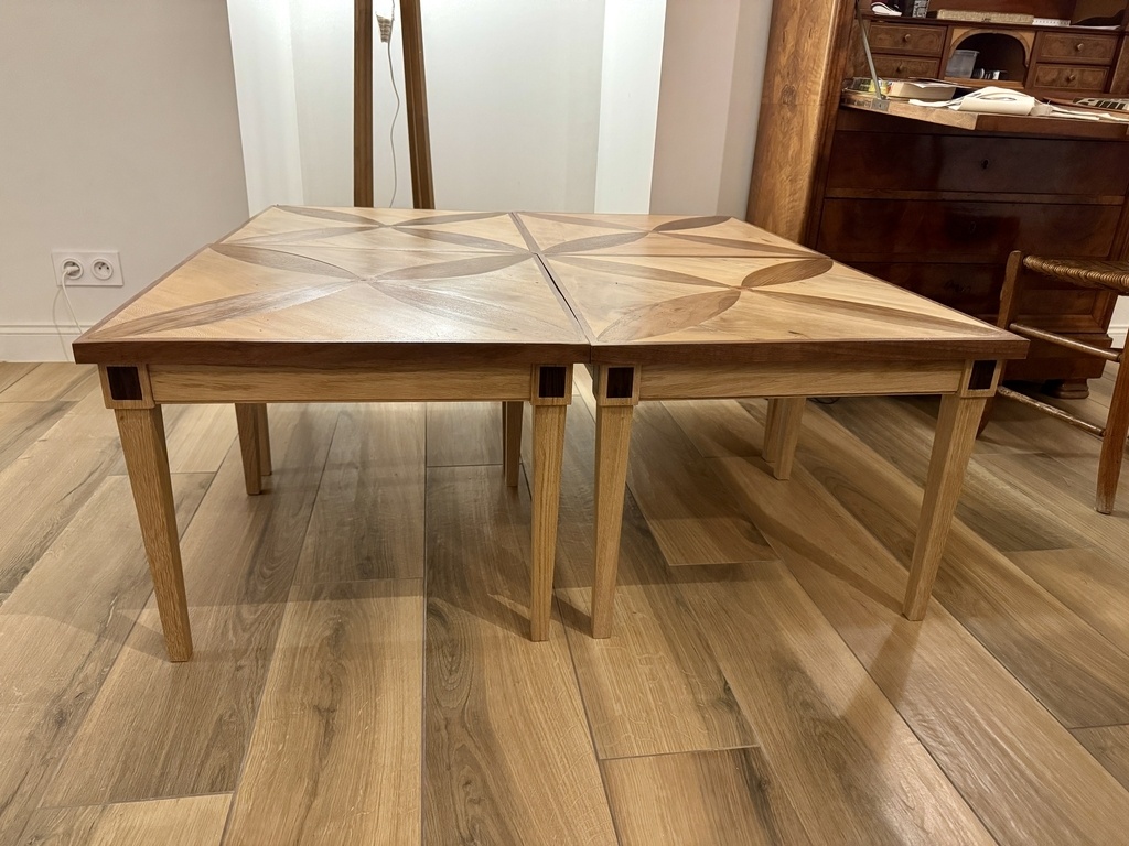 Une amie souhaitait 4 petites tables sur la base de carrés de parquet venant du château de sa grand-mère.